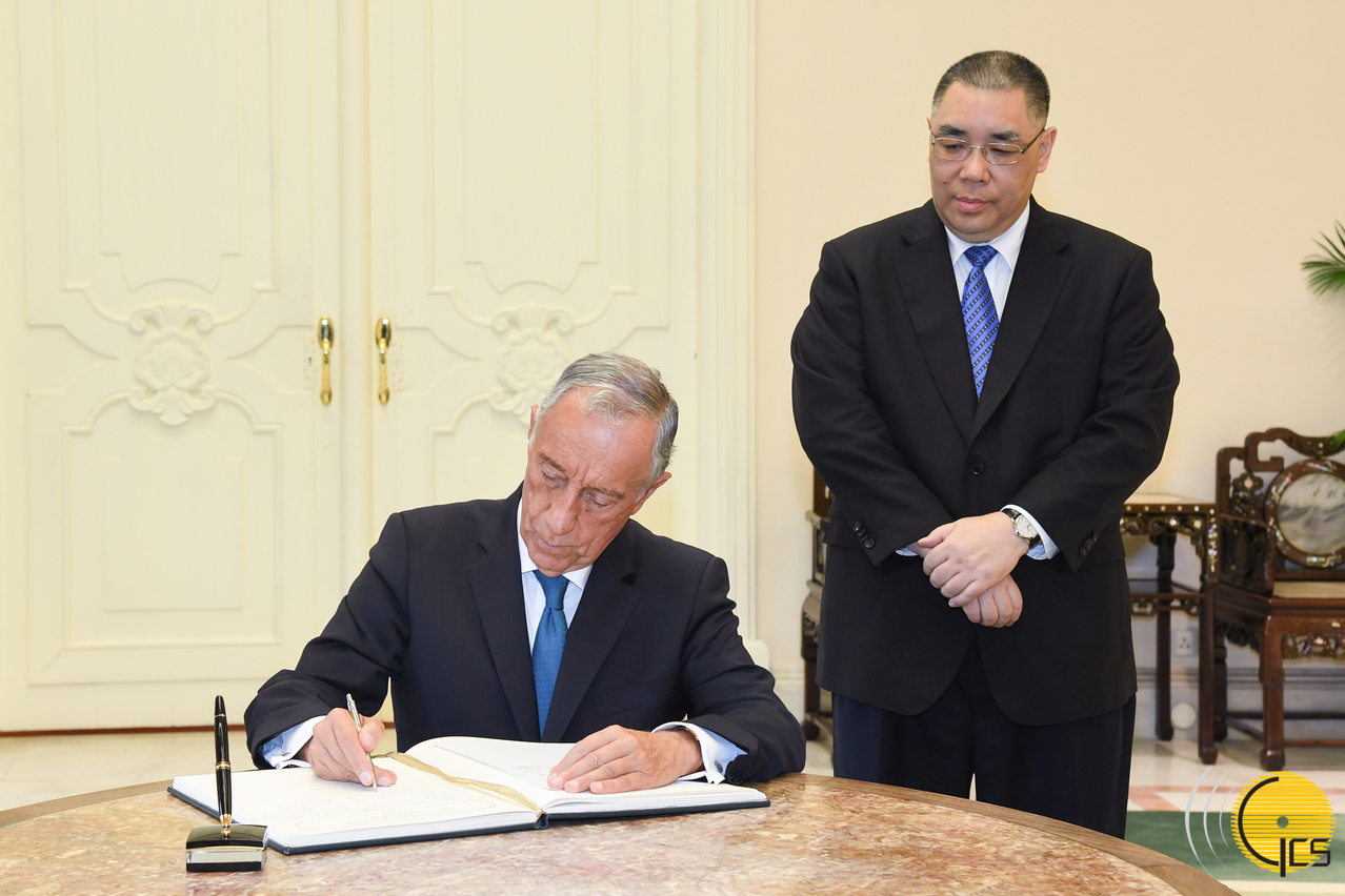 • Accompanied by the Chief Executive, Mr Chui Sai On, the President of the Portuguese Republic, Mr Marcelo Rebelo de Sousa, signs a guest book at the Government Headquarters in Macao.