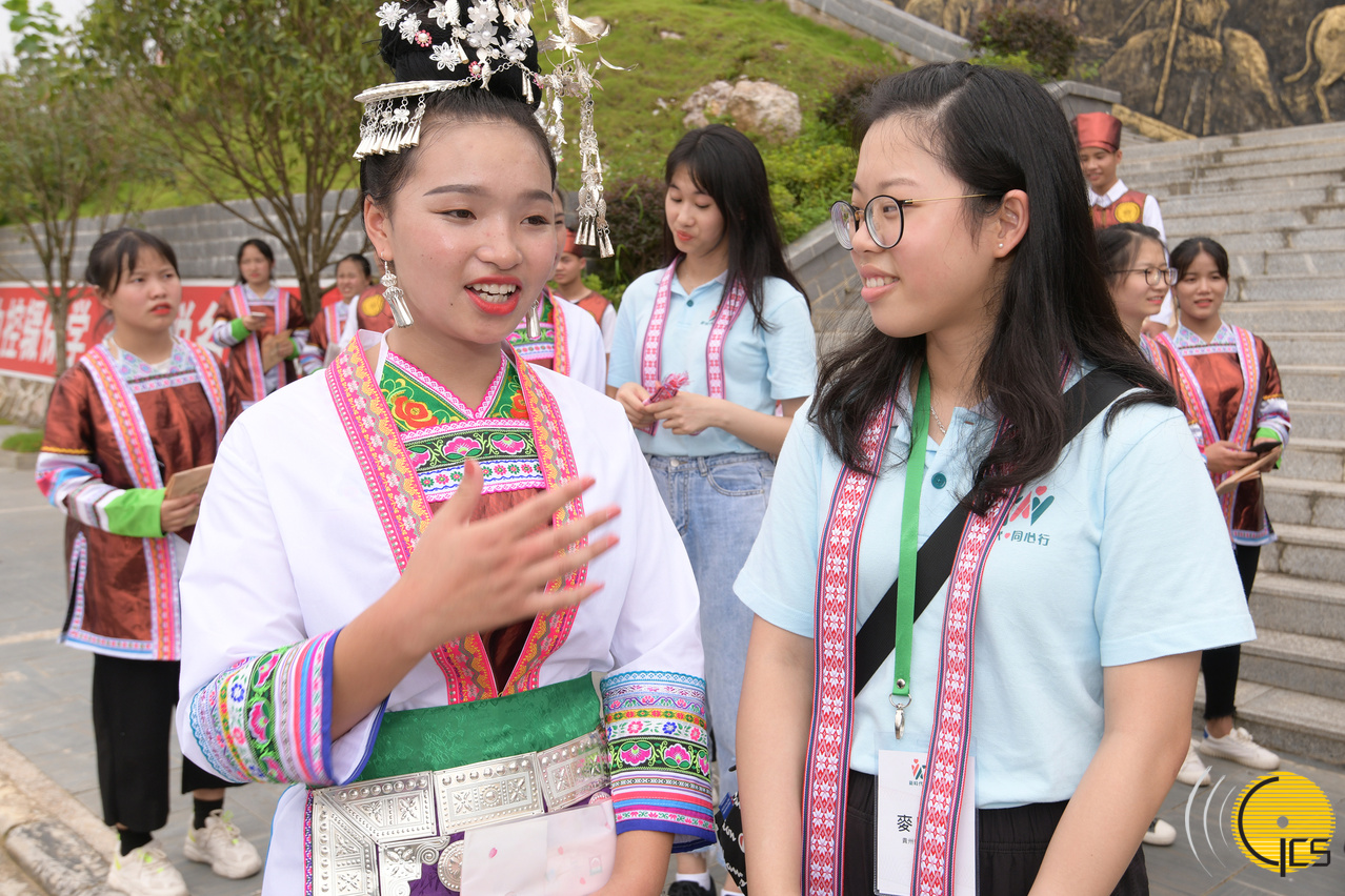 • Macao high school students joining the Guizhou delegation chat with students of the Congjiang County Second National Senior High School.