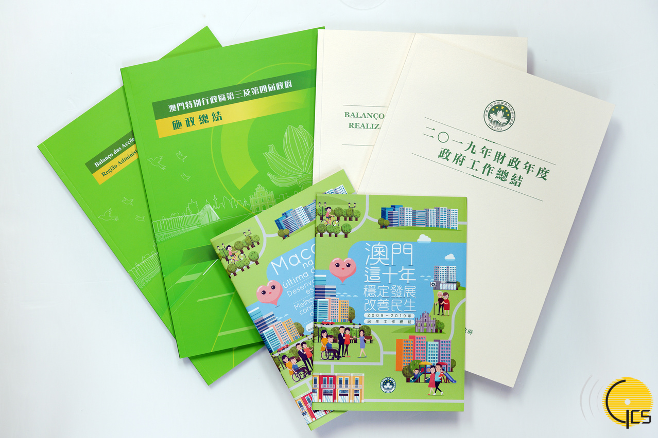 Hard copies and booklets of the "Review of the Government's Work in the Fiscal Year 2019" and the "Ten Years of Policy Implementation for Achieving Long-term Stability – A Summary of Policy Implementation by the Third- and Fourth-term Macao SAR Governments" are available for collection at various locations.