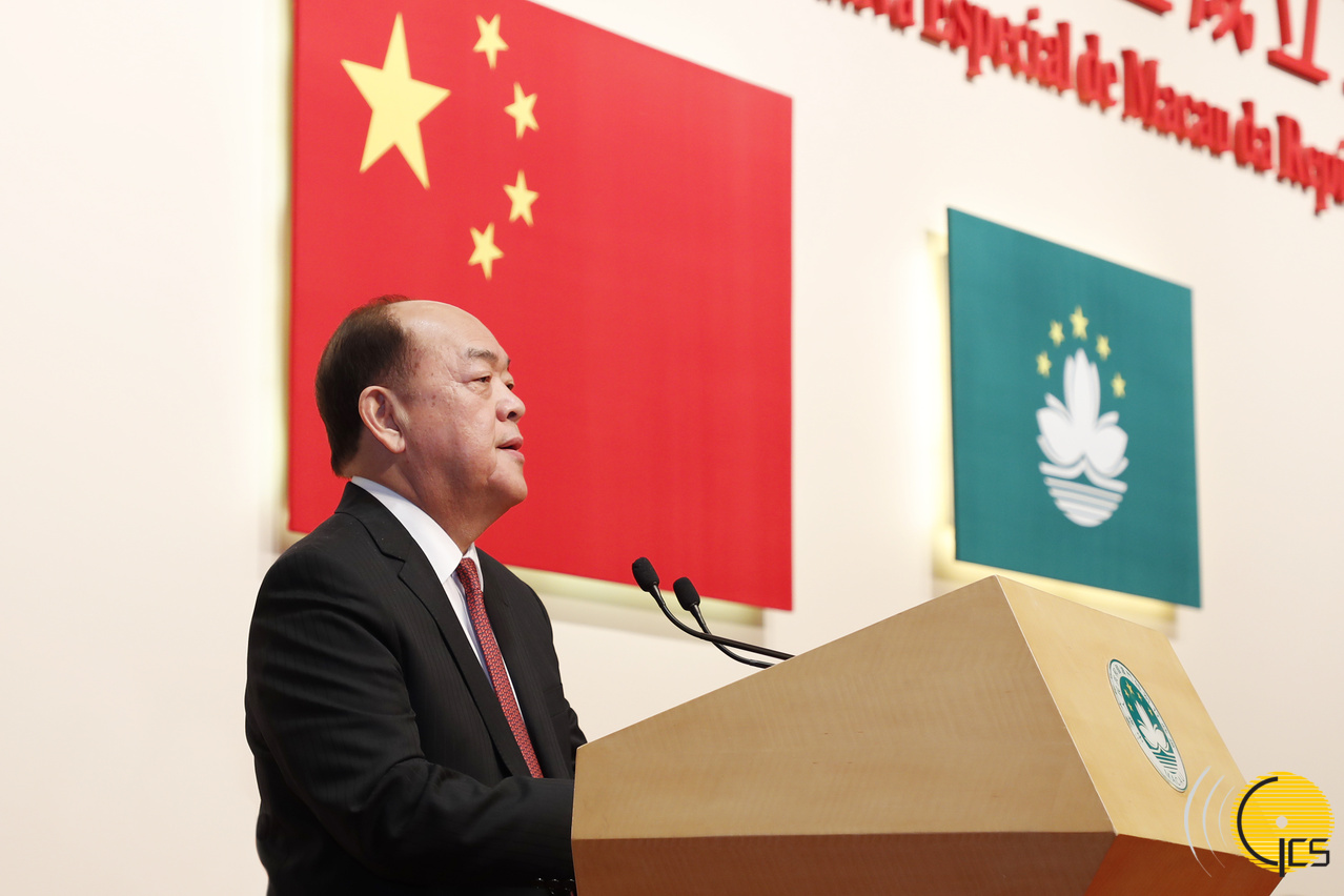 • The Chief Executive, Mr Ho Iat Seng, delivers a speech at the reception hosted by the Government to celebrate the 20th anniversary of the establishment of the Macao Special Administrative Region.