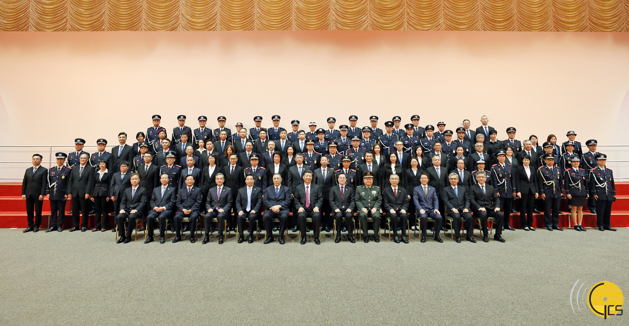 • President Xi Jinping meets with representatives of the disciplined services of the Macao Special Administrative Region and poses for a photo with them.