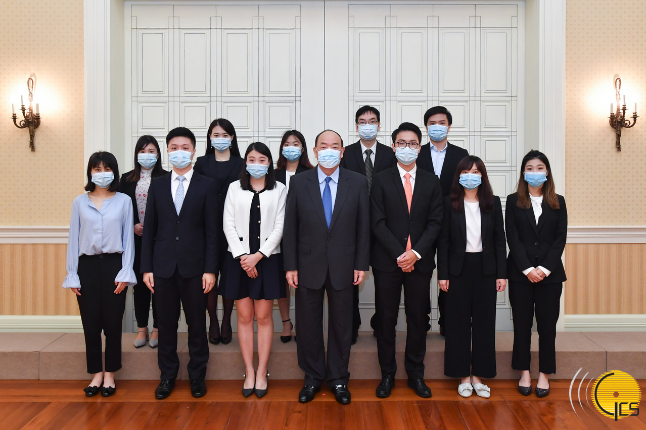 • The Chief Executive, Mr Ho Iat Seng, poses for a group photograph with the Chairperson of General Assembly of the General Association of Chinese Students of Macau, Ms Tai Ka Peng, during a meeting held at the Government Headquarters.
