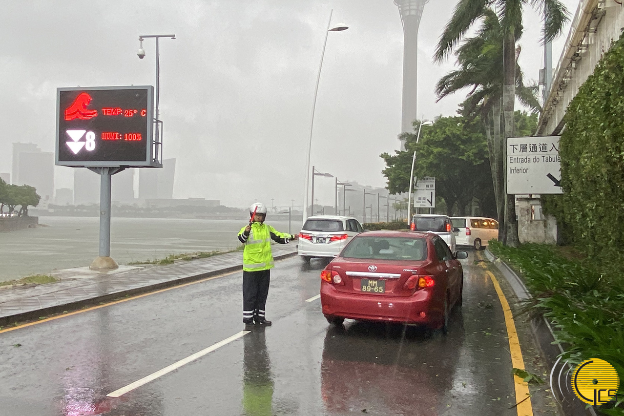 The personnel staff from the Public Security Police Force direct the traffic at the tunnel located at the lower lever of the Sai Wan Bridge which reopened after the typhoon signal has been lowered down from 9 to 8.