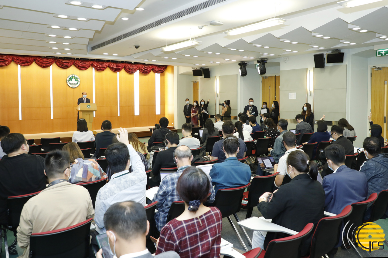 • The Chief Executive, Mr Ho Iat Seng, meets the press at the Government Headquarters after delivering the Policy Address for the Fiscal Year 2021 to the Legislative Assembly.