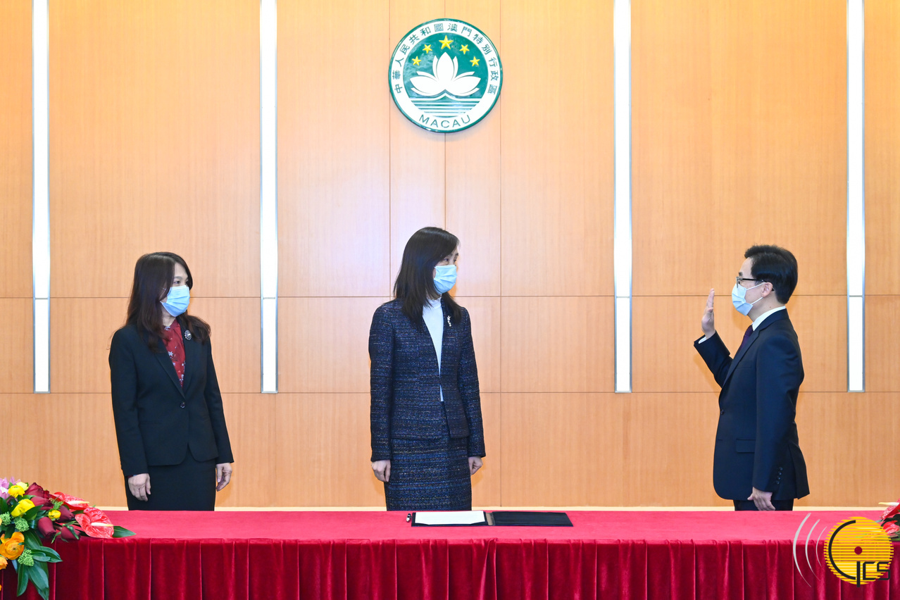 • The Secretary for Social Affairs and Culture, Ms Ao Ieong U, administers the swearing-in ceremony of the new Director of the Pharmaceutical Supervision and Administration Bureau, Mr Choi Peng Cheong.