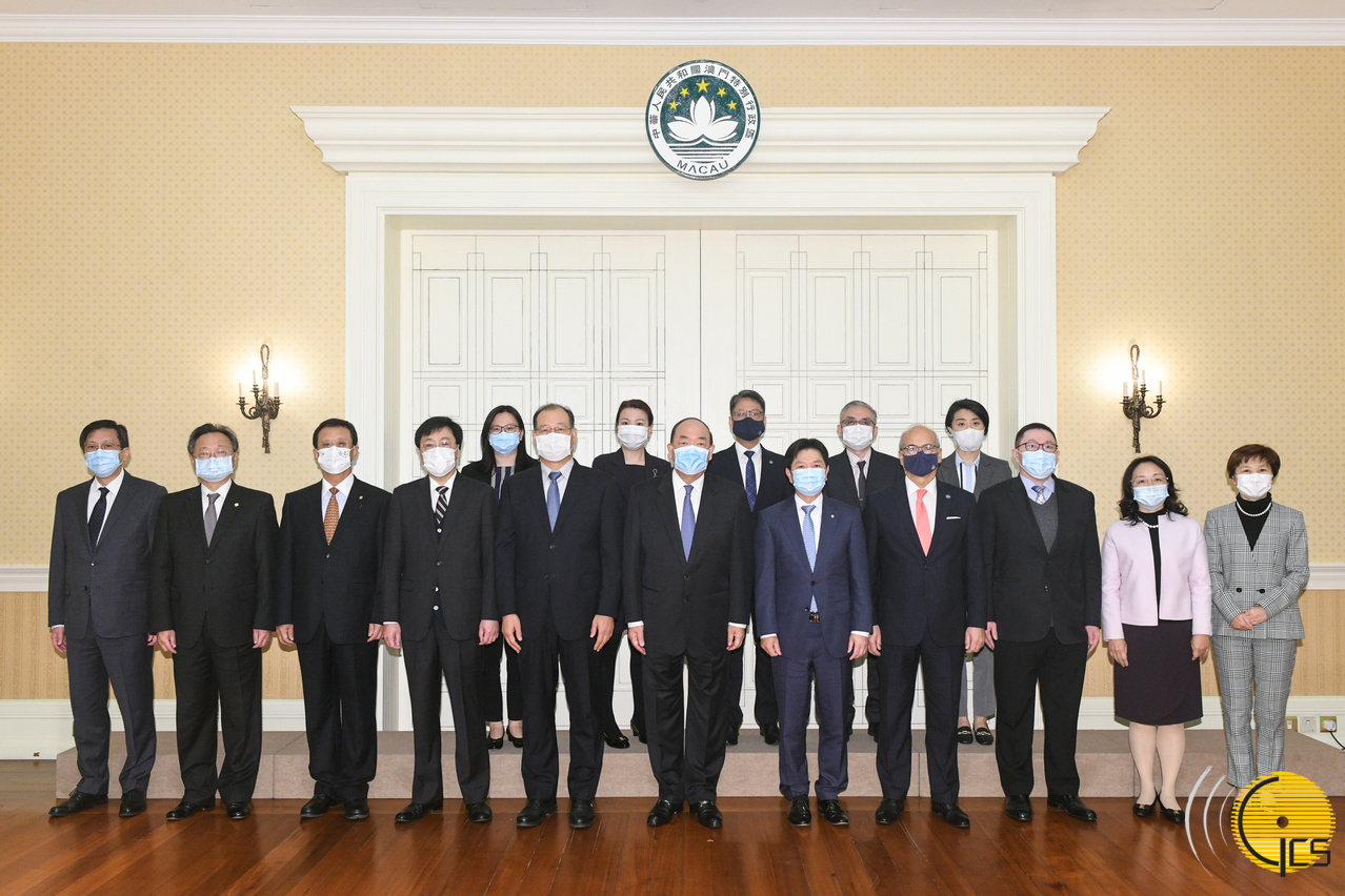 • The Chief Executive, Mr Ho Iat Seng, poses for a group photograph with the Chairman of the Macau Association of Banks, Mr Li Guang, during a meeting at the Government Headquarters.