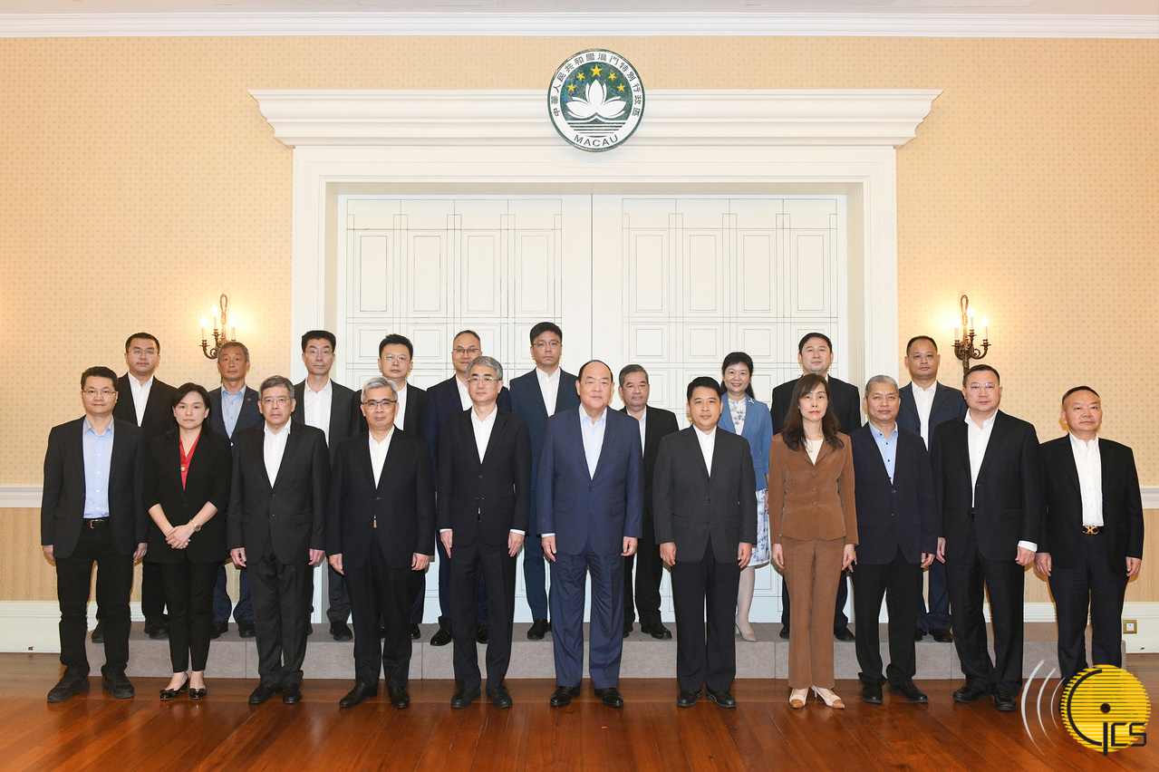 • The Chief Executive, Mr Ho Iat Seng, poses for a group photo with with deputy secretary of the CPC Zhuhai Municipal Committee and Mayor of Zhuhai, Mr Huang Zhihao.