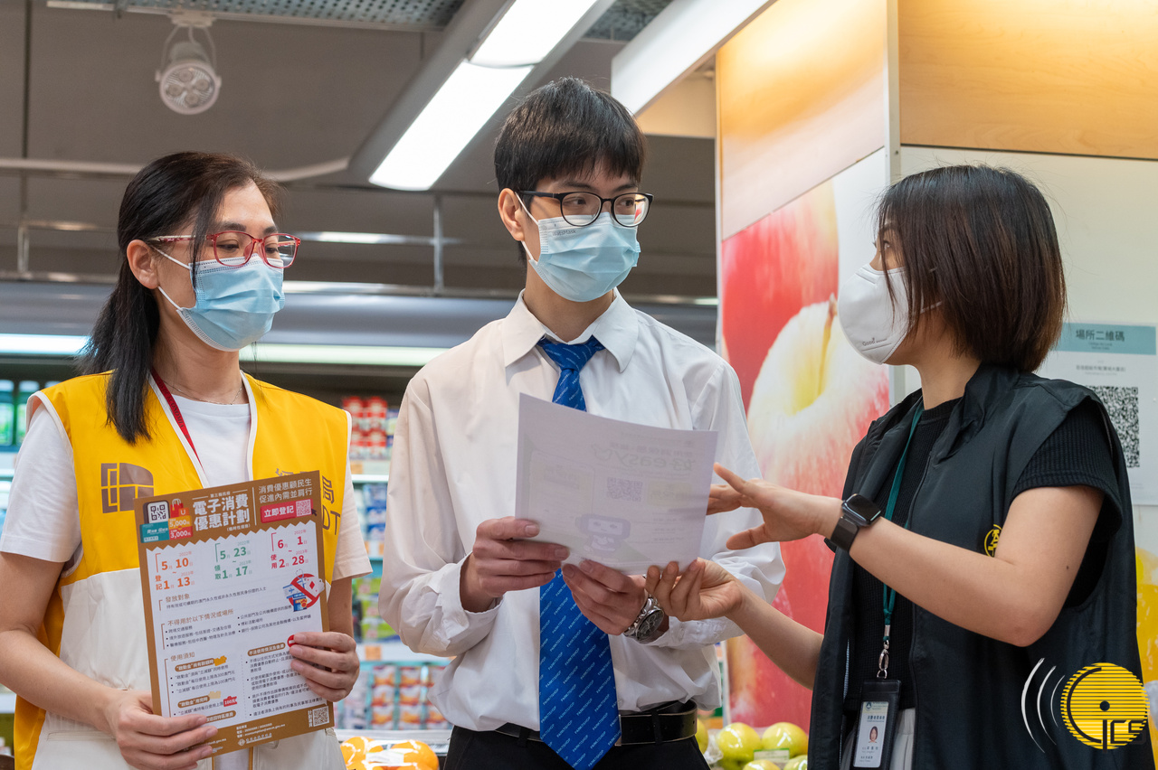 • On the first day of the implementation of the third round of the electronic consumption benefits plan, staff of the Economic and Technological Development Bureau and the Consumer Council inspect supermarkets and promote the plan.
