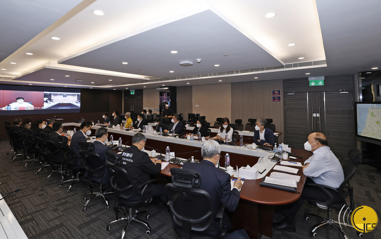 The Chief Executive, Mr Ho Iat Seng, leads representatives of MSAR Government departments in a videoconference with officials from Zhuhai Command Center for COVID-19 Prevention and Control