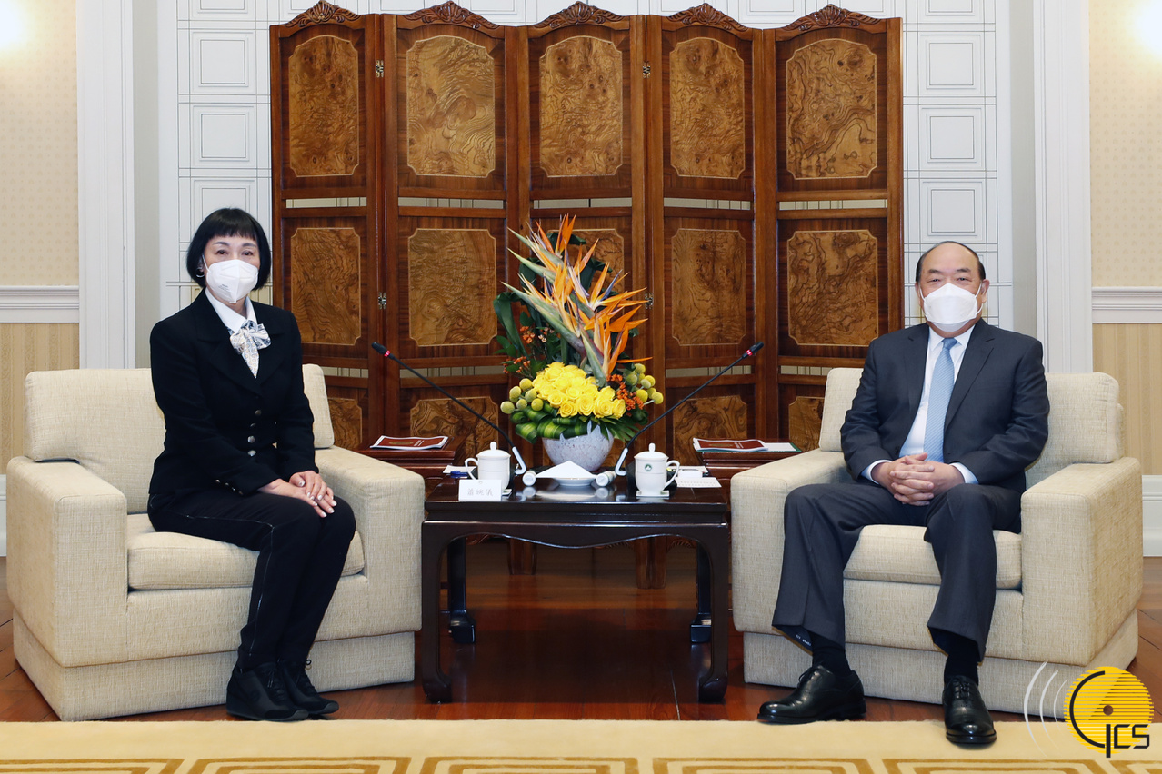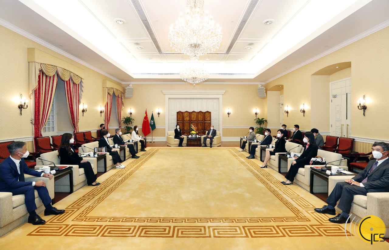 • The Chief Executive, Mr Ho Iat Seng, meets with the President of the Macao International Brand Enterprise Commercial Association, Ms Terry Sio, at the Government Headquarters.
