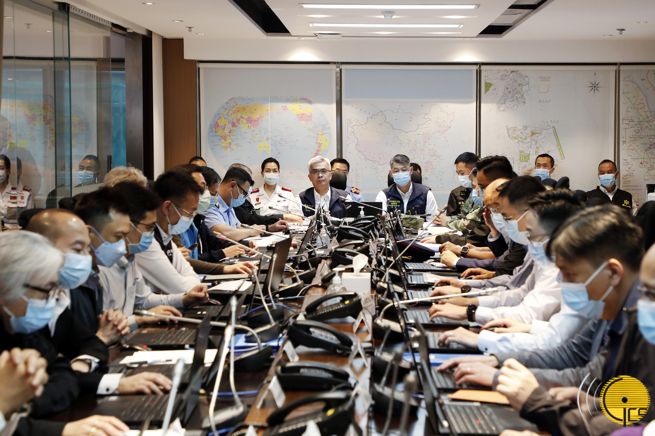 "Crystal Fish 2023" typhoon drill – The Secretary for Security and Commander of Joint Civil Protection Operations, Mr Wong Sio Chak, briefs reporters on effectiveness of the drill.