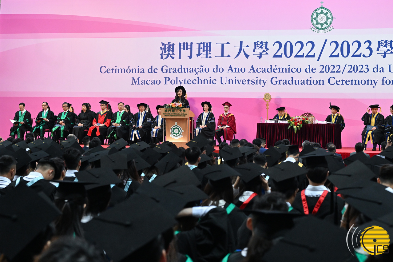 The Secretary for Social Affairs and Culture, Ms Ao Ieong U, attends the graduation ceremony for the 2022/2023 academic year of the Macao Polytechnic University , on behalf of the Chief Executive, Mr Ho Iat Seng.