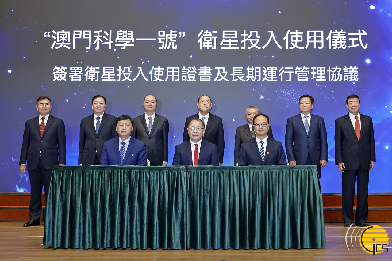 • The Chief Executive, Mr Ho Iat Seng; the Director of the Liaison Office of the Central People's Government in the Macao Special Administrative Region, Mr Zheng Xincong; and the Director of the National Space Administration of China, Mr Zhang Kejian, witness the signing of the inauguration certificate of the Macao Science 1 satellite (MSS-1)