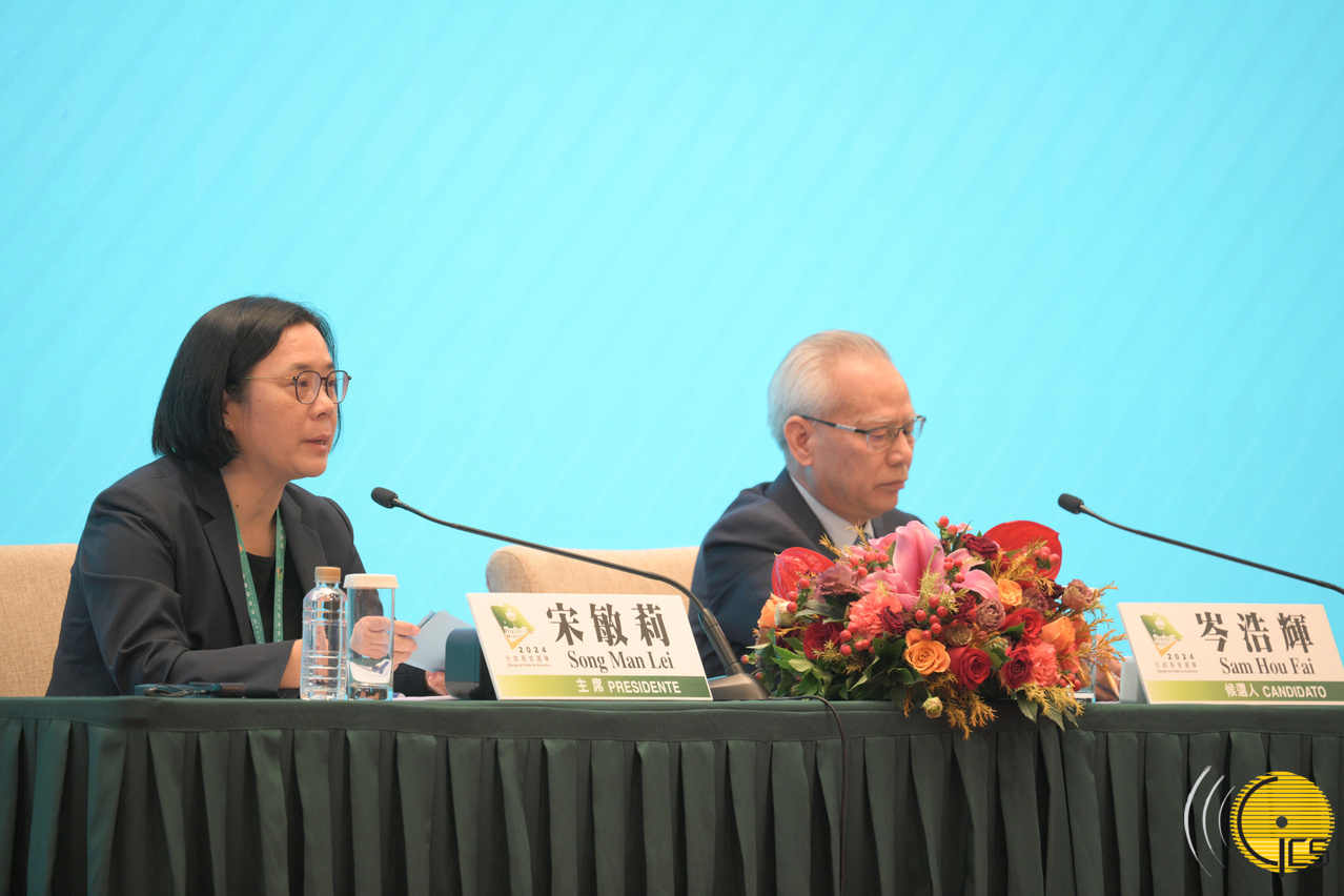 • The President of the Electoral Affairs Commission for the Chief Executive Election, Ms Song Man Lei, officiates at the presentation and question-and-answer session on the Political Platform of the Candidate of the 2024 Chief Executive Election.