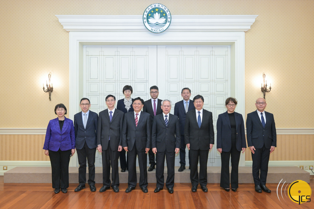 • The Chief Executive, Mr Sam Hou Fai, poses for a photograph with a delegation led by Secretary of the Leading Party Members Group and Vice Minister of Ecology and Environment, Mr Sun Jinlong, during a meeting held at the Government Headquarters in Macao.