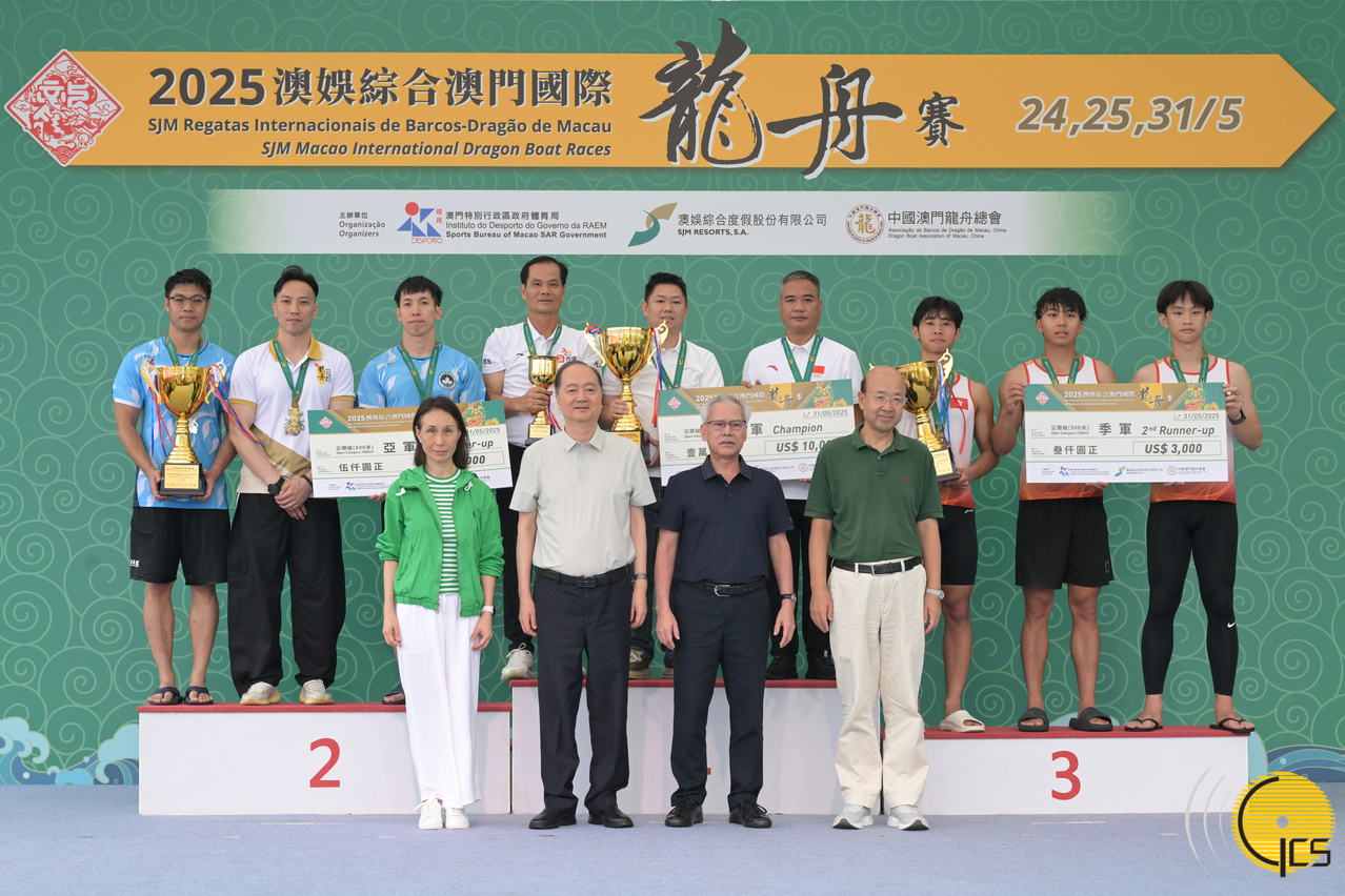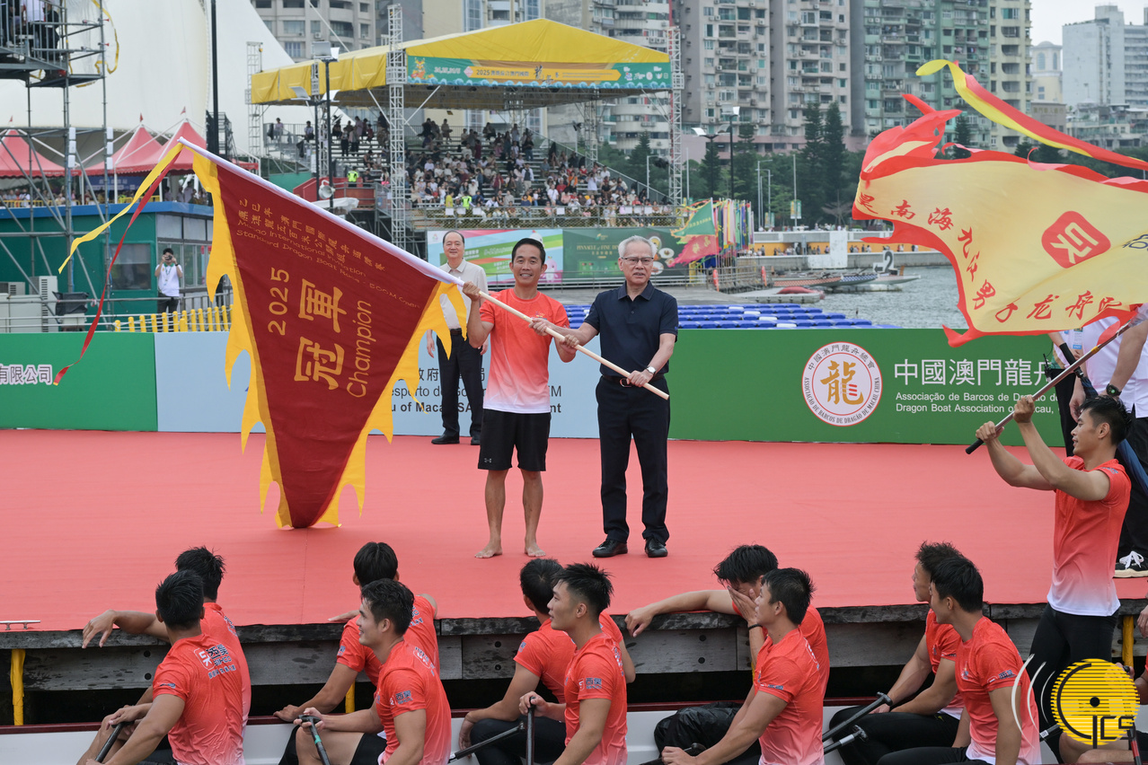 • The Chief Executive, Mr Sam Hou Fai, officiates at the award presentation ceremony for the standard dragon boat race under the open category of the 2025 Macao International Dragon Boat Races.