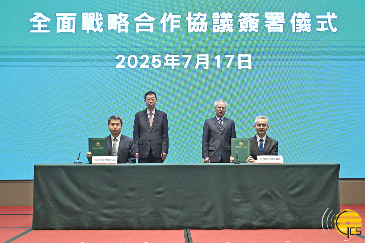 • The Chief Executive, Mr Sam Hou Fai, and the Chairman of Bank of China, Mr Ge Haijiao, witness the signing, by the Secretary for Economy and Finance, Mr Tai Kin Ip, and Executive Vice President of Bank of China, Mr Wu Jian, of the Comprehensive Strategic Cooperation Agreement on Bank of China's Services to the Macao Special Administrative Region Government, during a ceremony at the Guangdong-Macao Intensive Cooperation Zone in Hengqin.