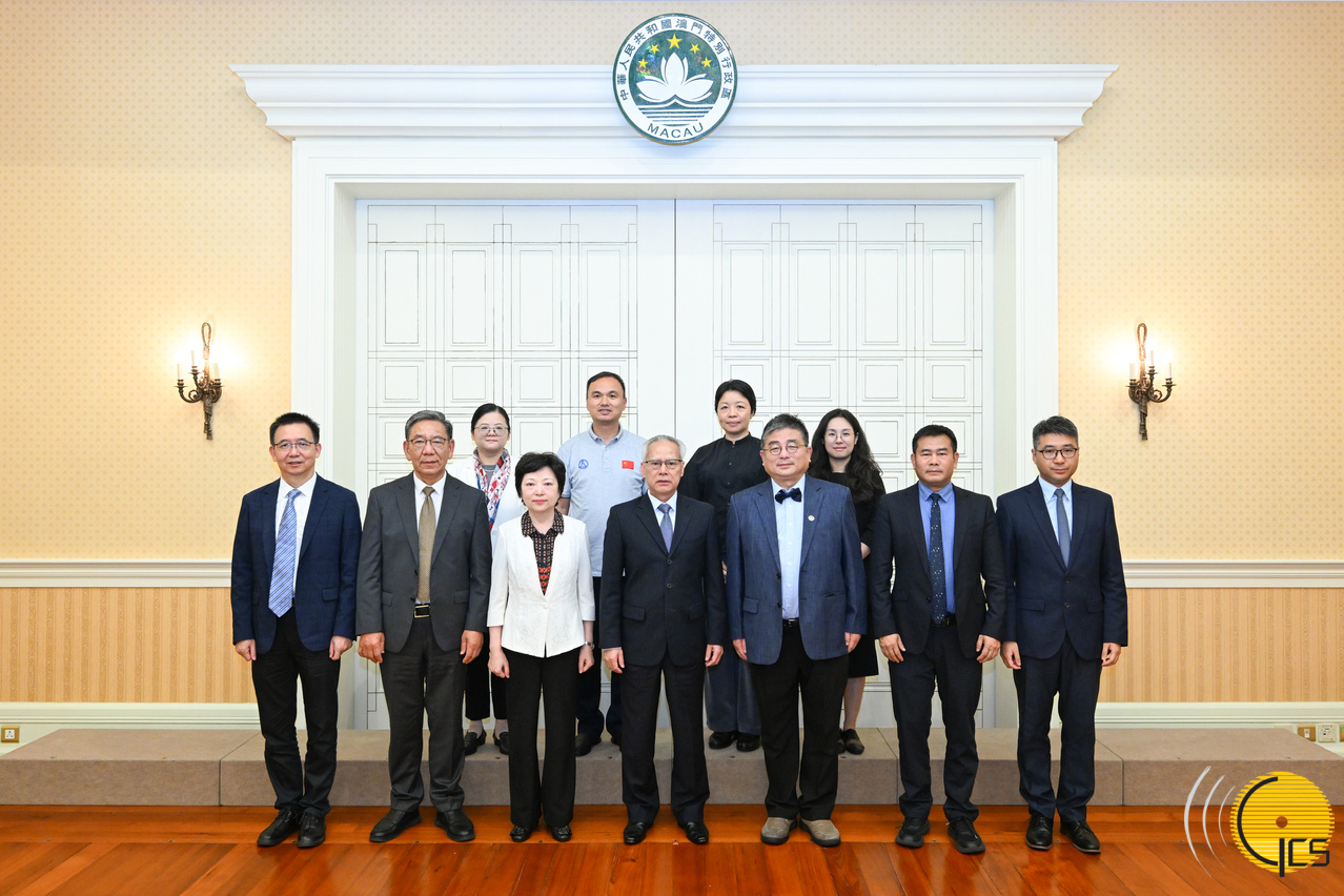 • The Chief Executive, Mr Ho Iat Seng, poses for a group photograph with the Party Secretary and Vice Chairperson of the China Soong Ching Ling Foundation, Ms Shen Beili, during a meeting at the Government Headquarters in Macao.