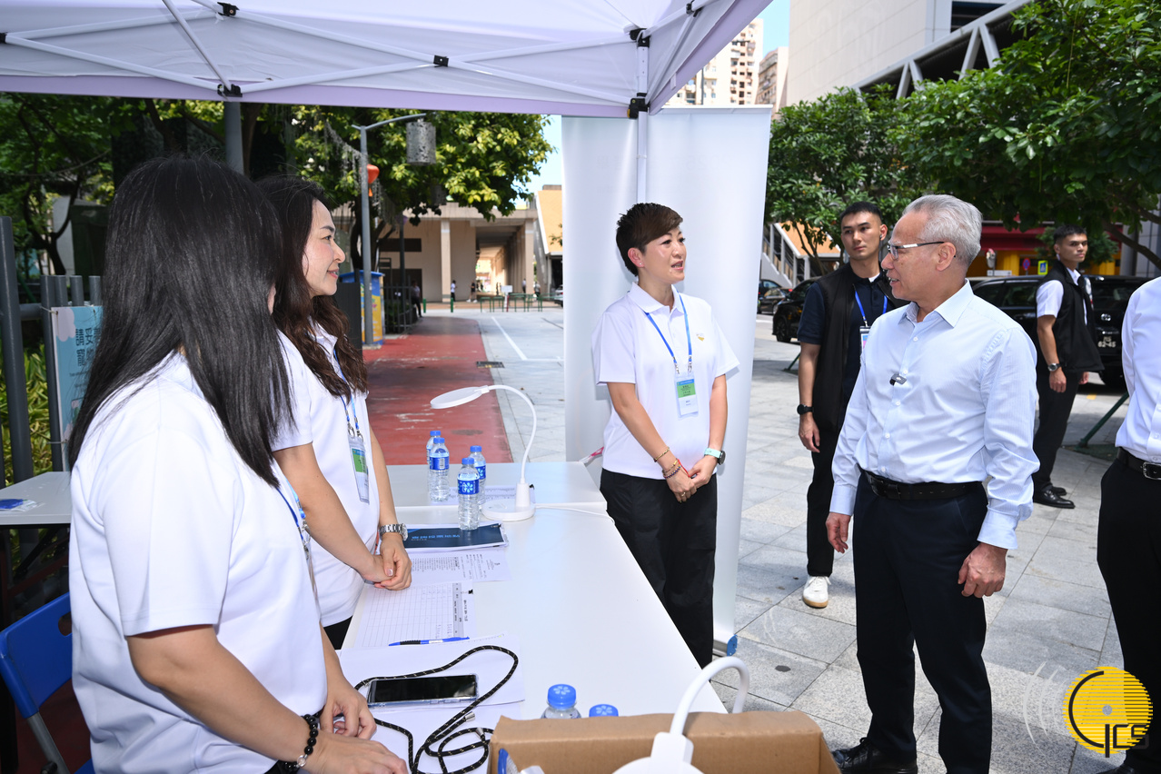 2025 Legislative Assembly Election: The Chief Executive, Mr Sam Ho Fai, inspects the Taipa Olympic Stadium polling station at around 12.20pm, visiting the waiting area outside the polling station and the Central Park service station to show support for frontline staff.