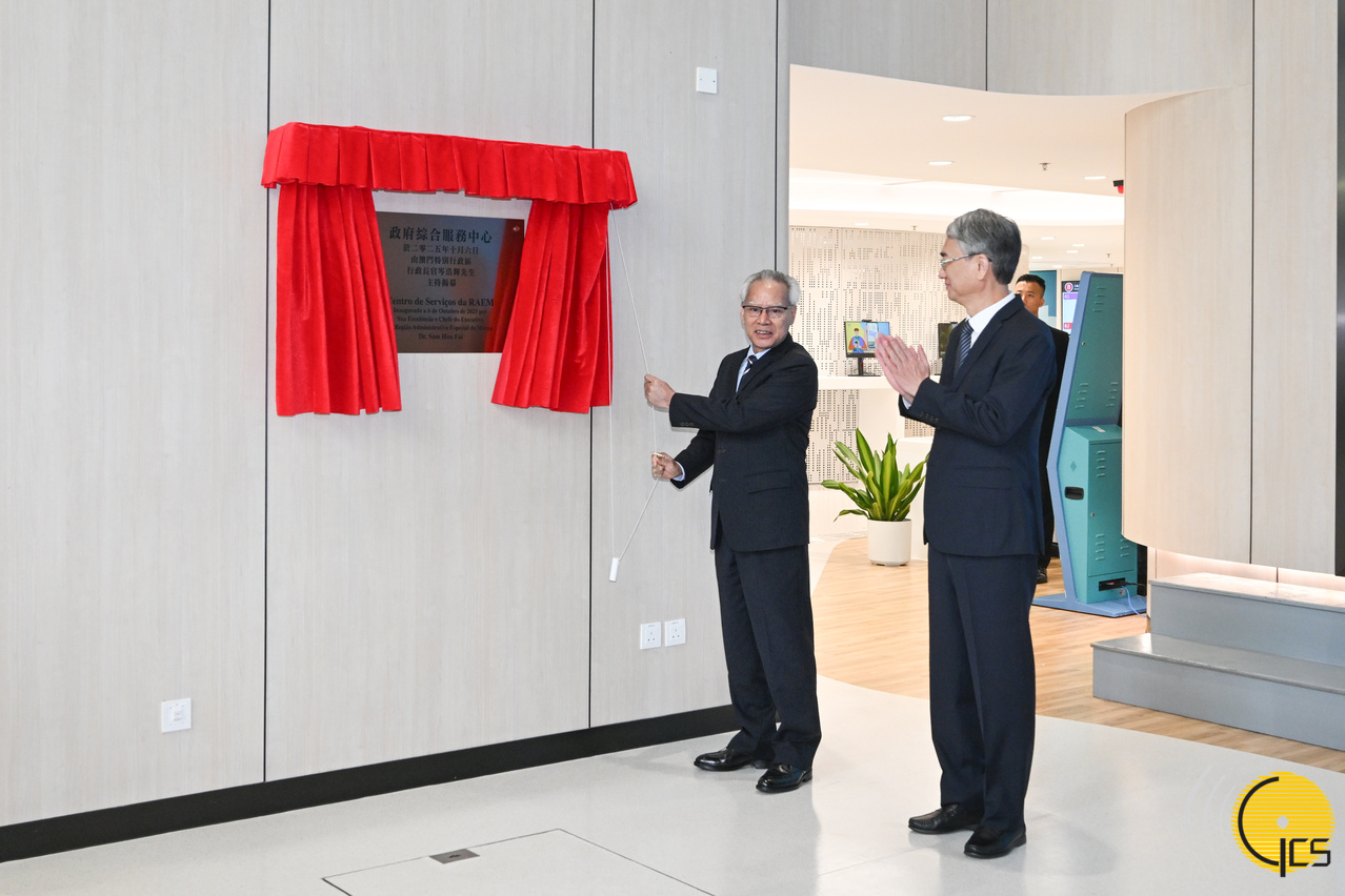 • The Chief Executive, Mr Sam Hou Fai, officiates at the plaque unveiling ceremony of the Macao Government Services Centre in Avenida de Venceslau de Morais.