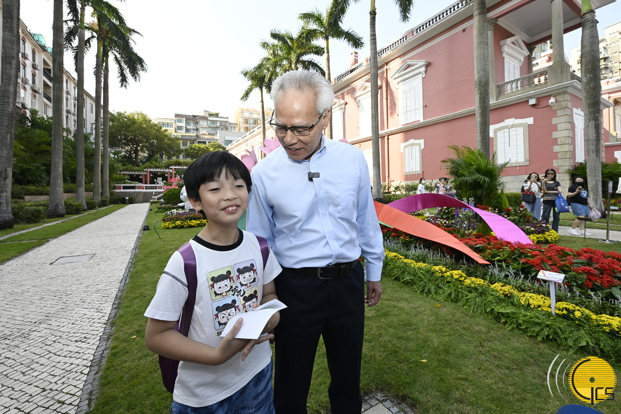 • The Chief Executive, Mr Sam Hou Fai, admires with visitors the floral arrangements, and pauses for a group photo against the backdrop of a sea of flowers.