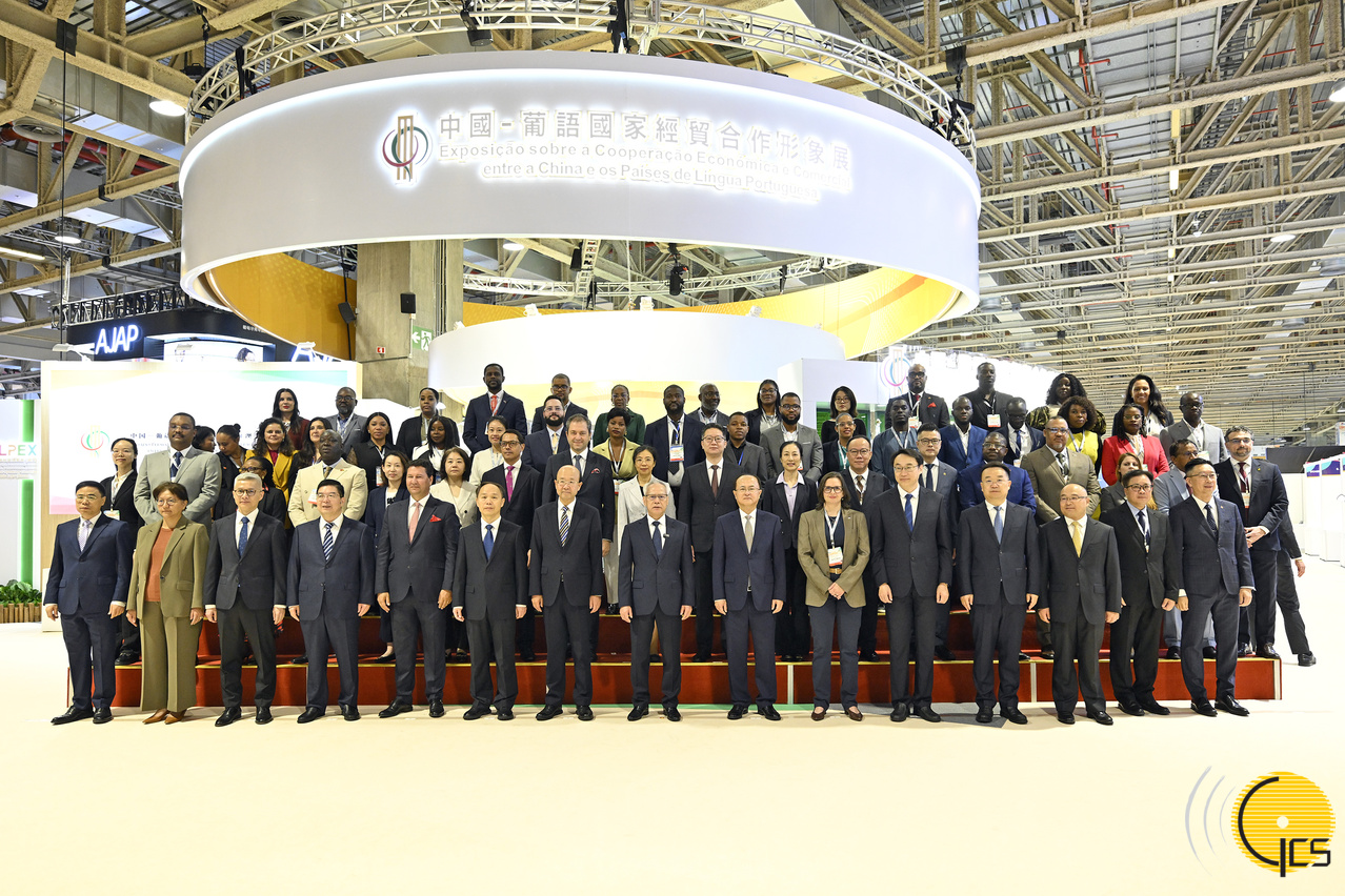 • The Chief Executive, Mr Sam Hou Fai, and guest pose for a group photograph at the China and Portuguese-speaking Countries Economic and Trade Cooperation Exhibition.