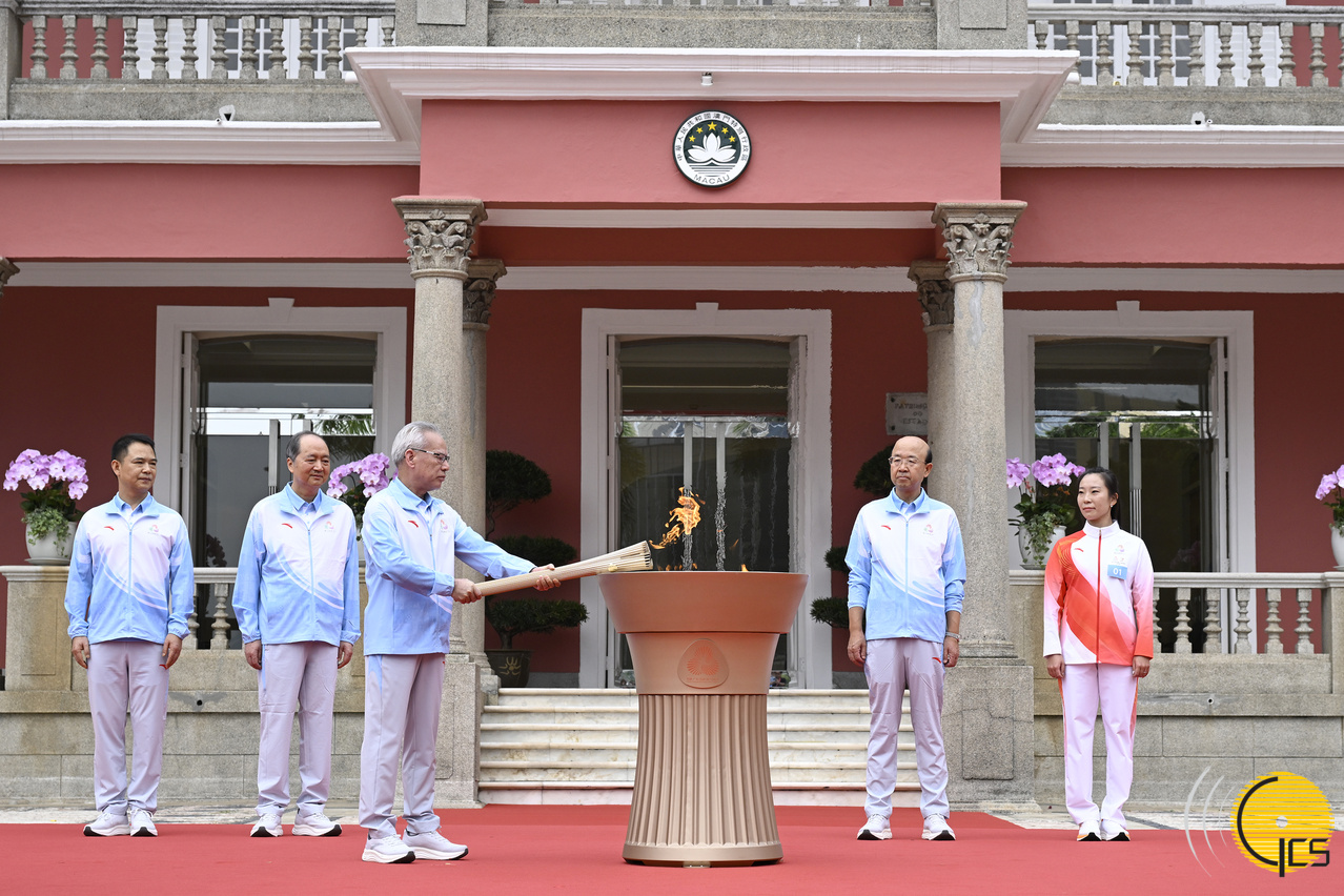 • Executive Director of the Organising Committee of the 15th National Games, the National Games for the Disabled, and the National Special Olympics, and the Chief Executive of the MSAR, Mr Sam Hou Fai, lights the relay torch from the cauldron.