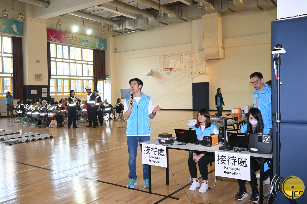 • "Crystal Fish 2026" civil protection drill – a representative of the Social Welfare Bureau explains the various facilities at the emergency shelter.