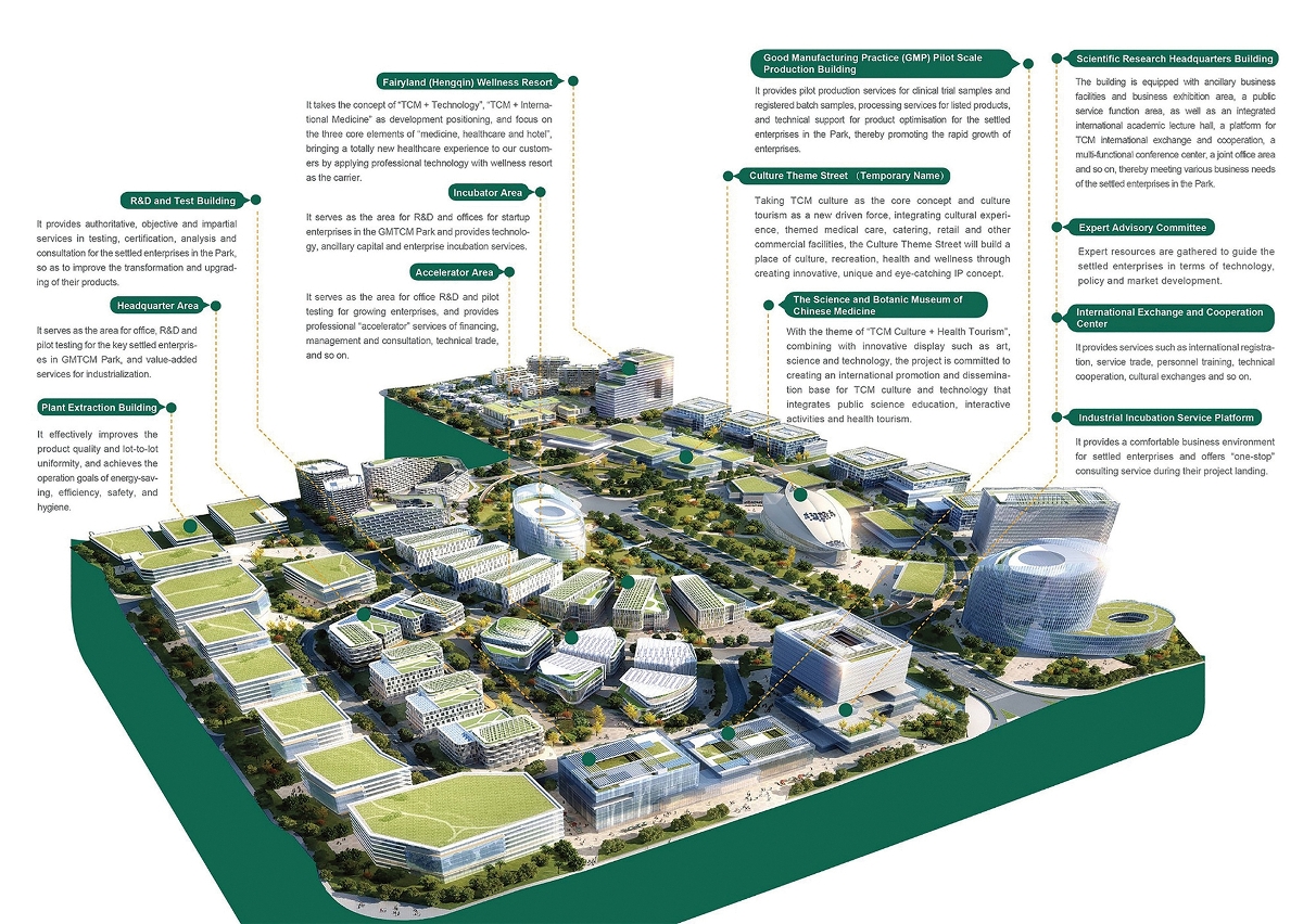 Covering an area of 500,000 square metres in a hi-tech zone of Hengqin New Area – with plans to expand to over 900,000 square metres – the Guangdong–Macao Traditional Chinese Medicine Technology Industrial Park (GMTCM Park) officially launched on 19 April 2011 in the Hengqin New Area. It became the first project implemented in the Guangdong–Macao Cooperation Industrial Park following an agreement signed that year between the governments of Guangdong province and Macao.