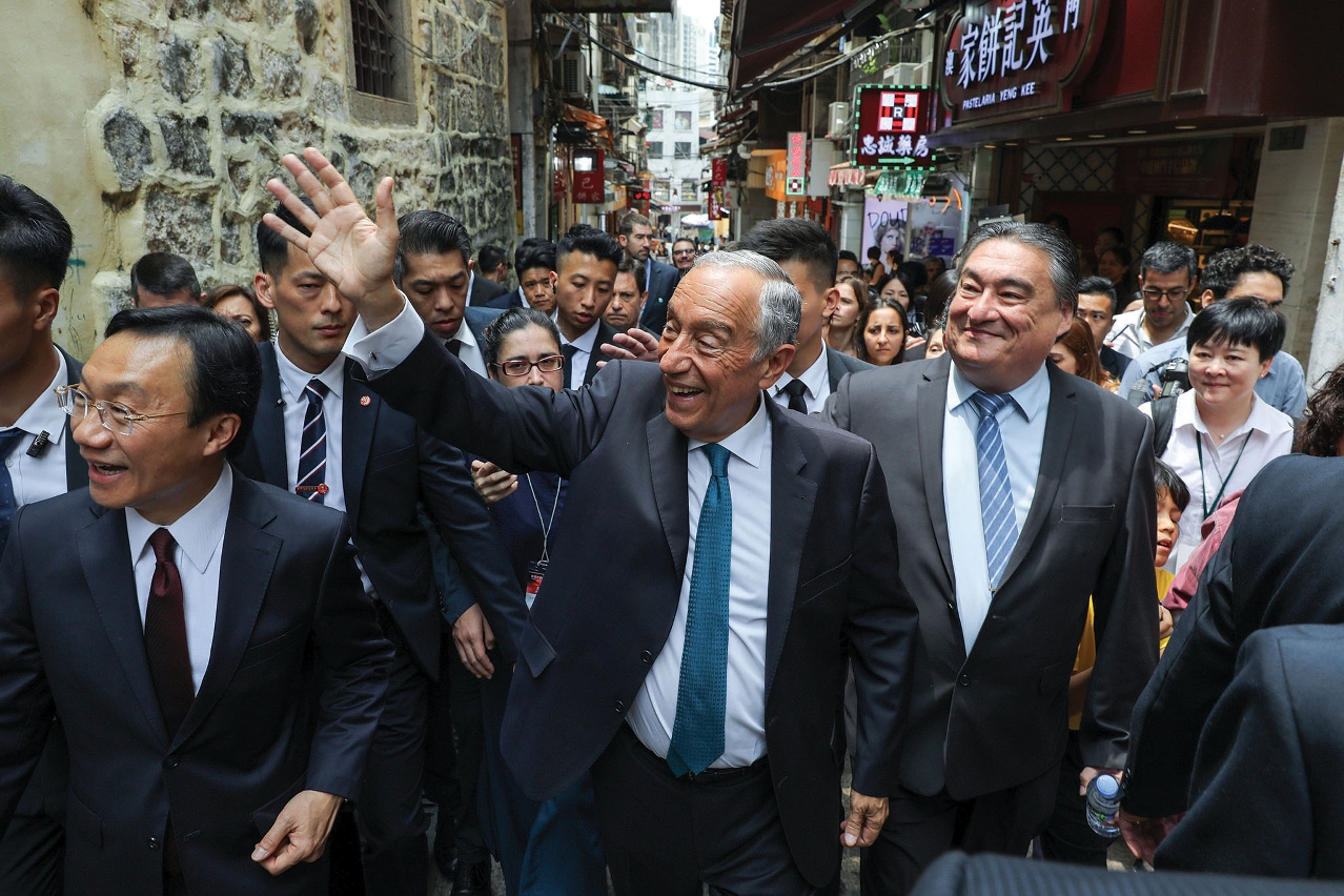During a walking tour through the Historic Centre of Macao where he visited the Holy House of Mercy and strolled from Largo do Senado to the Ruins of St Paul’s with Secretary of Social Affairs and Culture Alexis Tam Chon Weng, Rebelo de Sousa tried some Macao-style egg tarts and Chinese tea and greeted fellow passersby.
