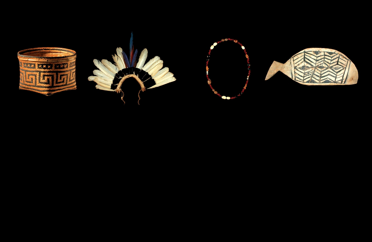 (From left to right) Handwoven basket made by the Baniwa people in Brazil; feather diadem made by the Karajá people in Brazil; decorative necklace from Brazil's Rio Negro area; domestic scoop made by the Kamayurá people in Mato Grosso