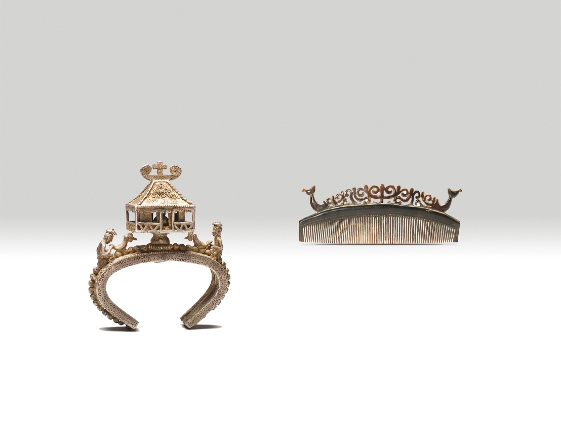Silver bracelet used by men and women during traditional dances in Timor-Leste (left); tortoise comb used by women in Timor-Leste (right)