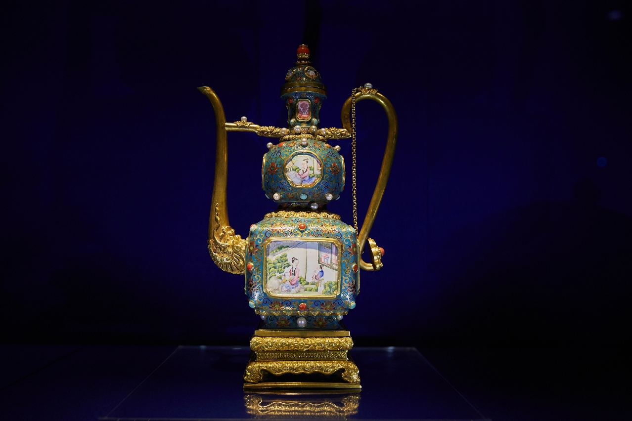 A painted enamel gold teapot with landscapes and figures from the Qianlong period of the Qing dynasty, between 1736 and 1795.