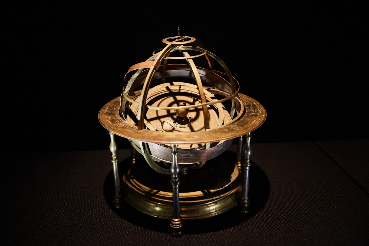 A gilt-bronze armillary orrery, which is a mechanical model of the solar system that illustrates the positions and motions of the planets and moons, with seven celestial bodies displayed. This is from the 18th century.