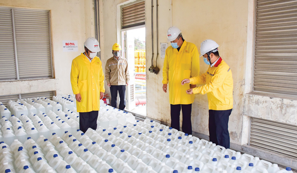 On behalf of the government, Secretary for Economy and Finance Lei Wai Nong receives 4,000 litres of disinfectant alcohol donated from the Nam Kwong Group | Photo by Government Information Bureau (GCS)