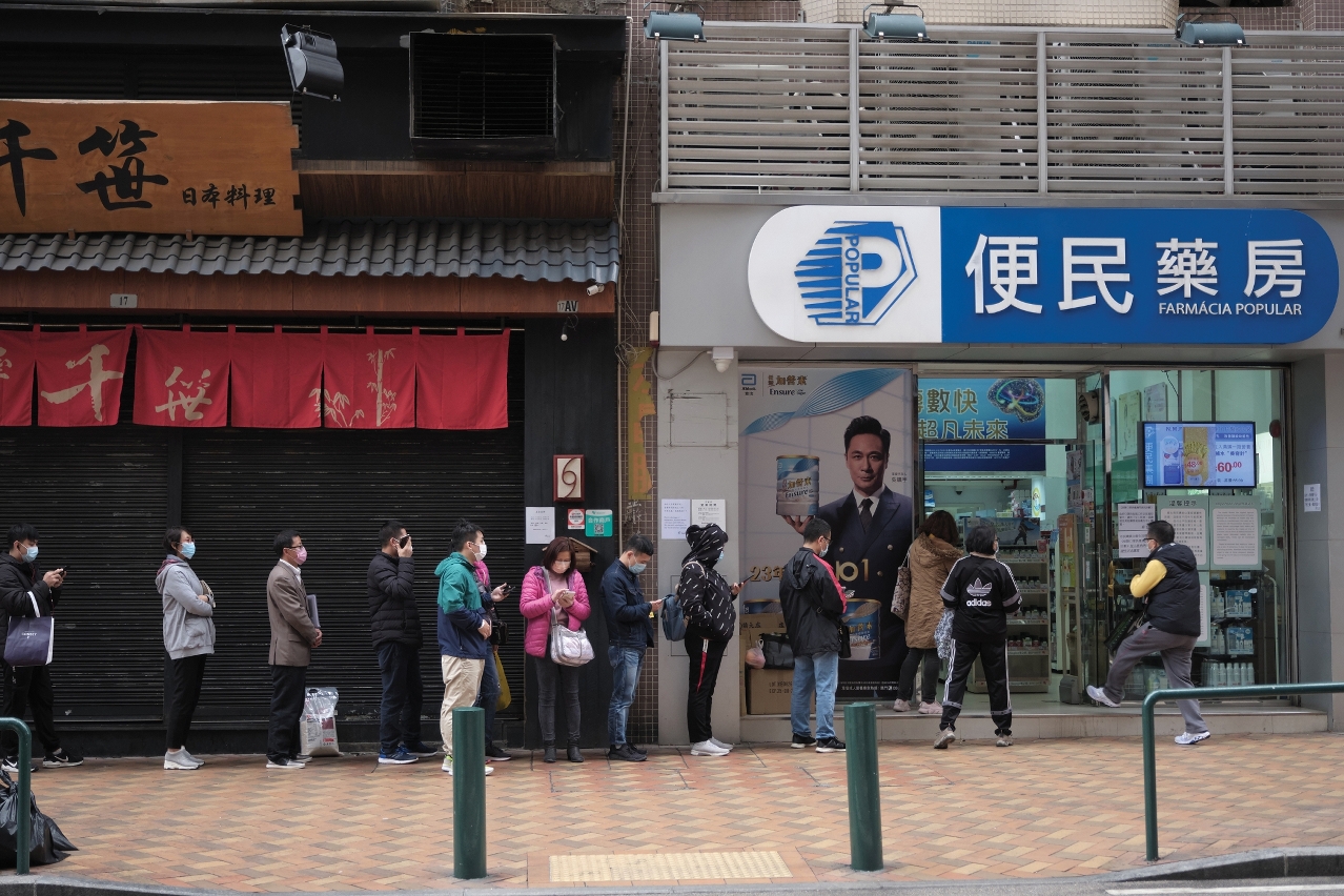 Citizens queue up to buy facemasks at a Macao pharmacy | Photo by António Sanmarful