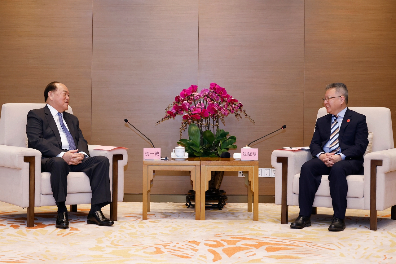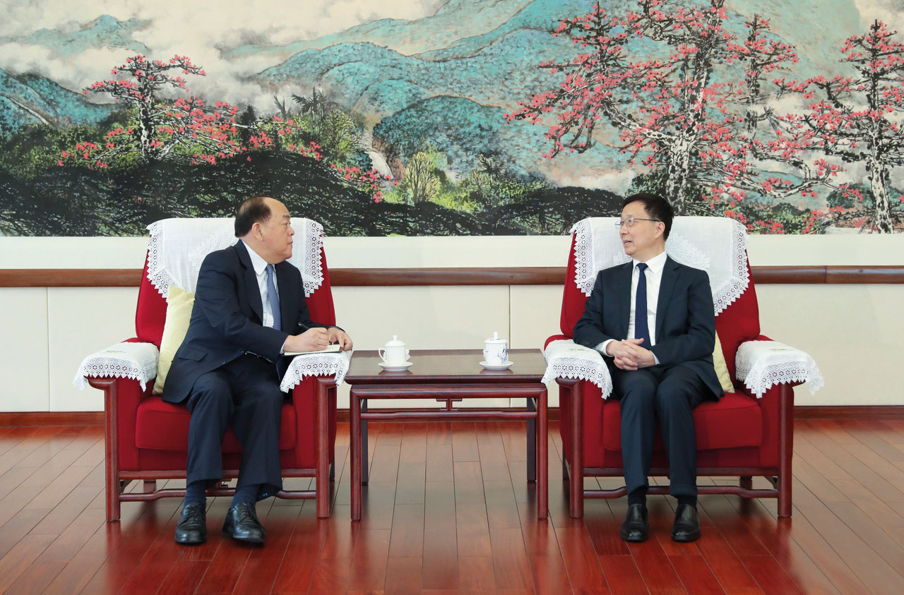 Ho Iat Seng meets with secretary of the Hainan Provincial Committee of the CPC, Shen Xiaoming 丨 Photo by Government Information Bureau