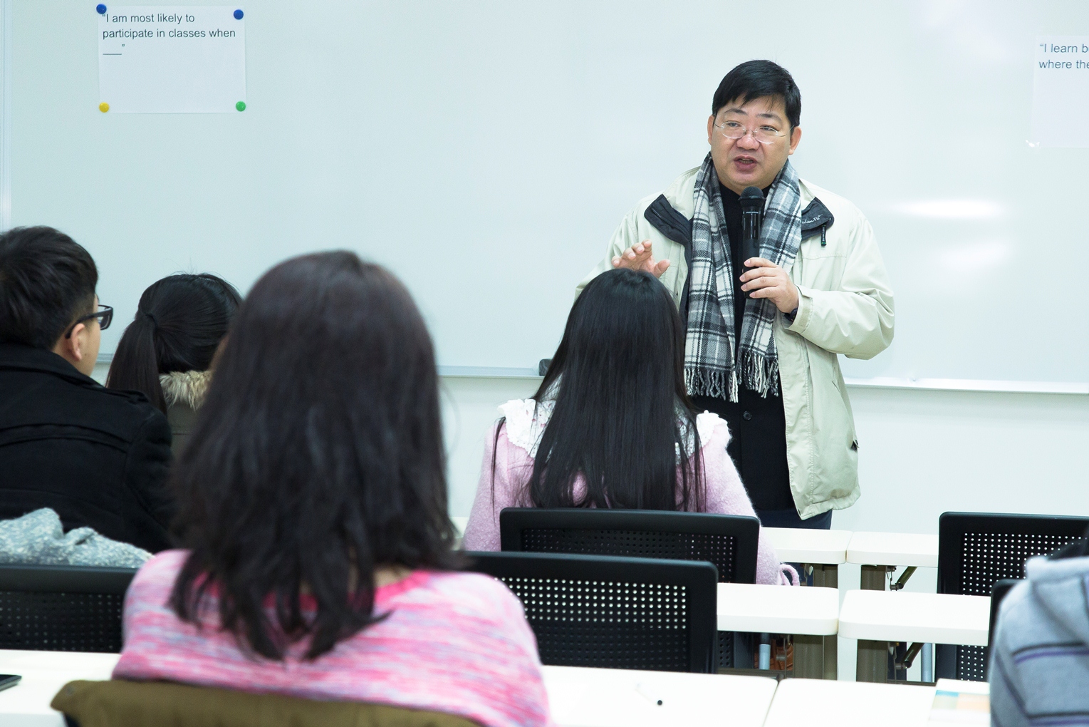 At this moment, courses that take place on the new campus are mainly general education courses in English, Portuguese and computer as well as some courses offered by the Faculty of Law. The majority of the courses are still conducted on the current campus. The first class on the new campus is International Business Law for first-year postgraduate students. The unseasonably chilly weather and the sudden rain didn’t dampen the students’ enthusiasm for the start of the new semester. Some of them arrived at the classroom half an hour early to get a feel for the new campus. The first two students to arrive for the class praised the new campus, “It is spacious and beautiful and the facilities are very good. Plus, it takes only ten minutes to walk to the classroom from our dormitory, which is very convenient.” Prof. Li Guo’an, a visiting scholar from Xiamen University, who taught the first class, also praised the new campus for its easy access.