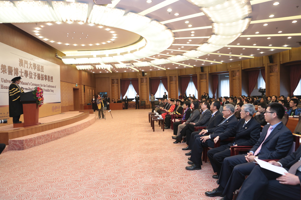 Guests at the ceremony included Xu Ting, director of the Department of Culture and Education of the Liaison Office of the Central People’s Government in the Macao SAR; Zhao Lingshan, deputy director of Hong Kong, Macao and Taiwan Affairs Office of the Ministry of Education; Hong Wai, director of the Office of the Macao Special Administrative Region in Beijing; Qiu Yong, president of Tsinghua University, Beijing; Lam Kam Seng, chair of UM’s University Council; Wei Zhao, rector of UM; Lionel M Ni, vice rector (academic affairs) of UM; Philip Chen, dean of UM’s Faculty of Science and Technology; and Liu Chuan Sheng, master of UM’s Chao Kuang Piu College. Lam Kam Seng presented the honorary degree to Prof Yang in the company of Rector Wei Zhao. Faculty members and students from UM and Tsinghua University, as well as Macao residents studying in Beijing, also attended the ceremony.