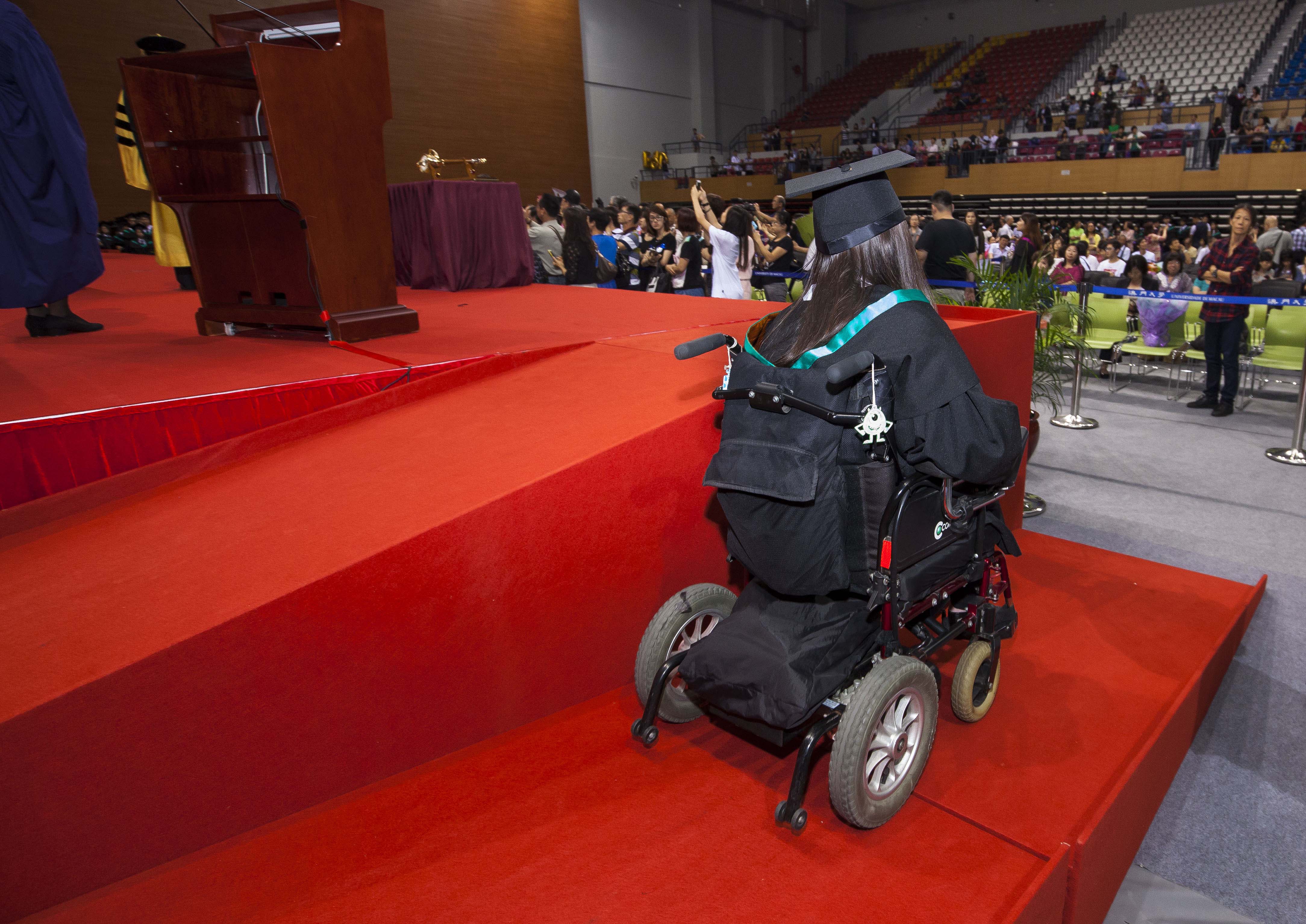 Chui Sai On officiated at the ceremony in the company of Secretary for Social Affairs and Culture Tam Chon Weng, UM’s University Council Chair Lam Kam Seng, UM Rector Wei Zhao, and Vice Rectors Lionel Ni, Rui Martins, Haydn Chen, and Alex Lai. More than 4,000 people attended the ceremony, including members of UM’s University Assembly, University Council, and Senate; government officials; prominent members of the community; students’ parents; and UM faculty and staff. This year UM set up ramps by the stage to facilitate graduates with disabilities.