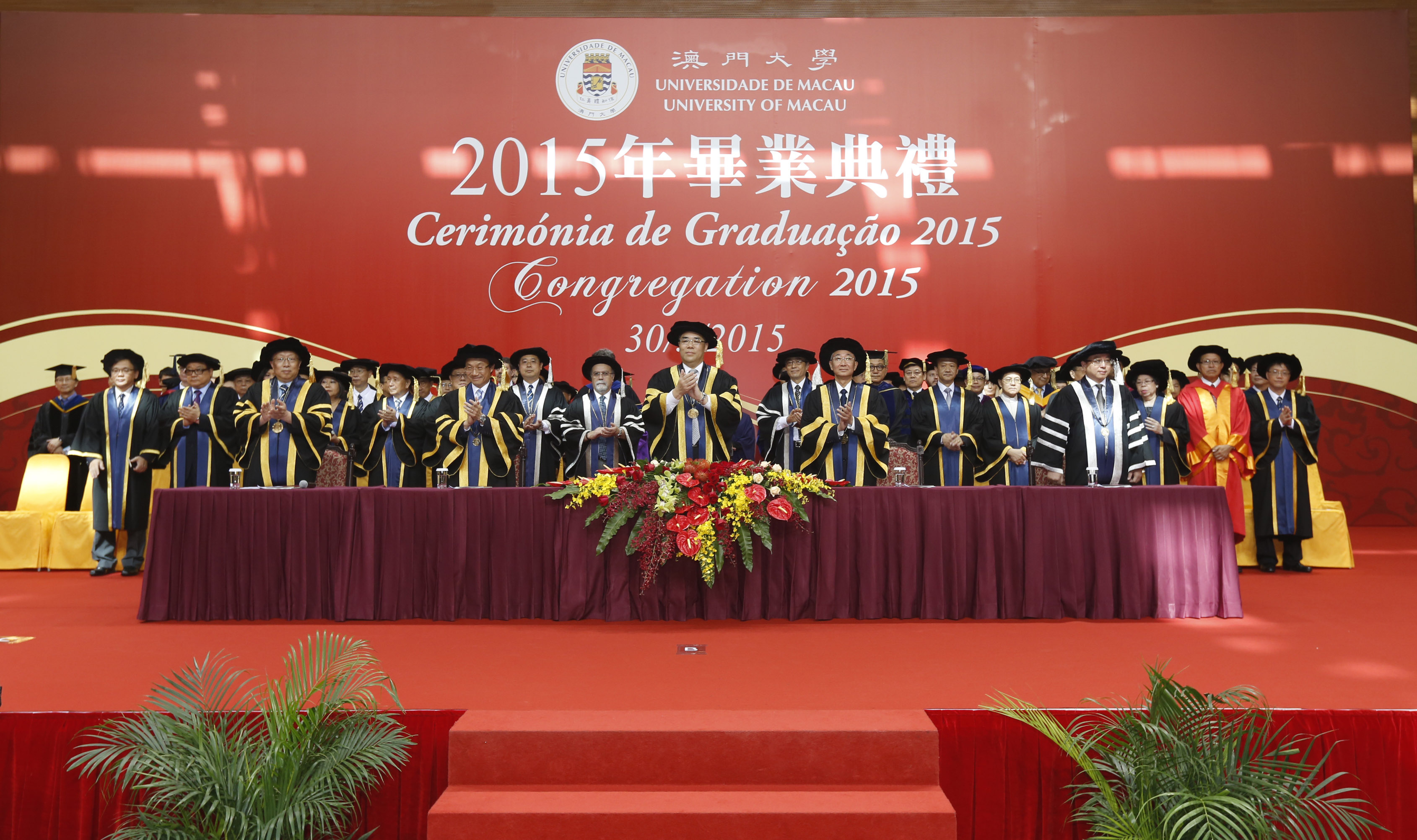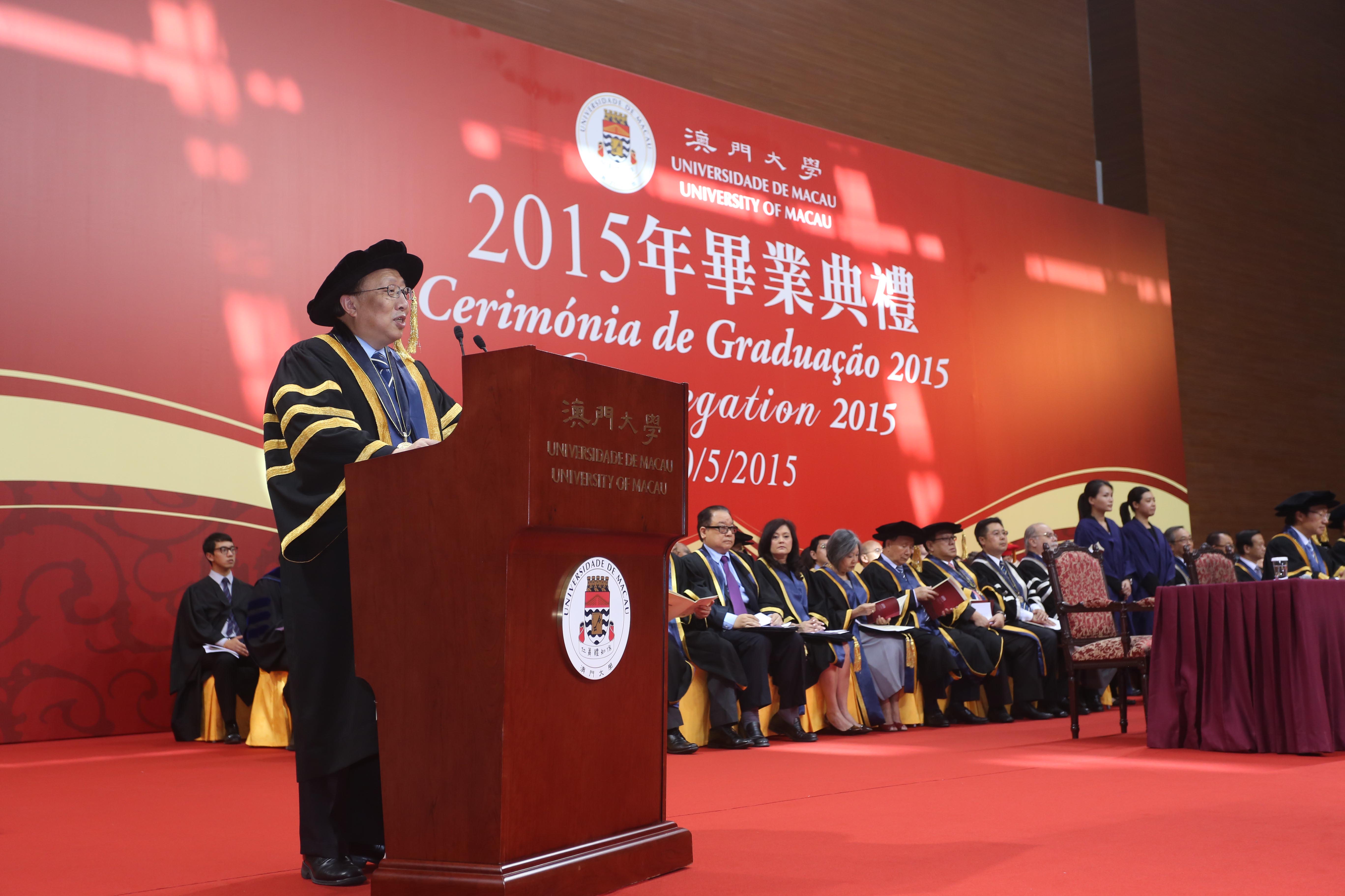 The University of Macau (UM) held the Congregation 2015 in its Sports Complex today (30 May) to present certificates to more than 1,000 graduating students. Chui Sai On, chief executive of the Macao SAR and chancellor of UM, noted at the ceremony that UM’s increasing international influence plays a positive role in promoting Macao’s image internationally, and he believes that UM will continue to occupy an important position on the higher education scene in Macao and make significant contributions to improving the overall quality of higher education in Macao.