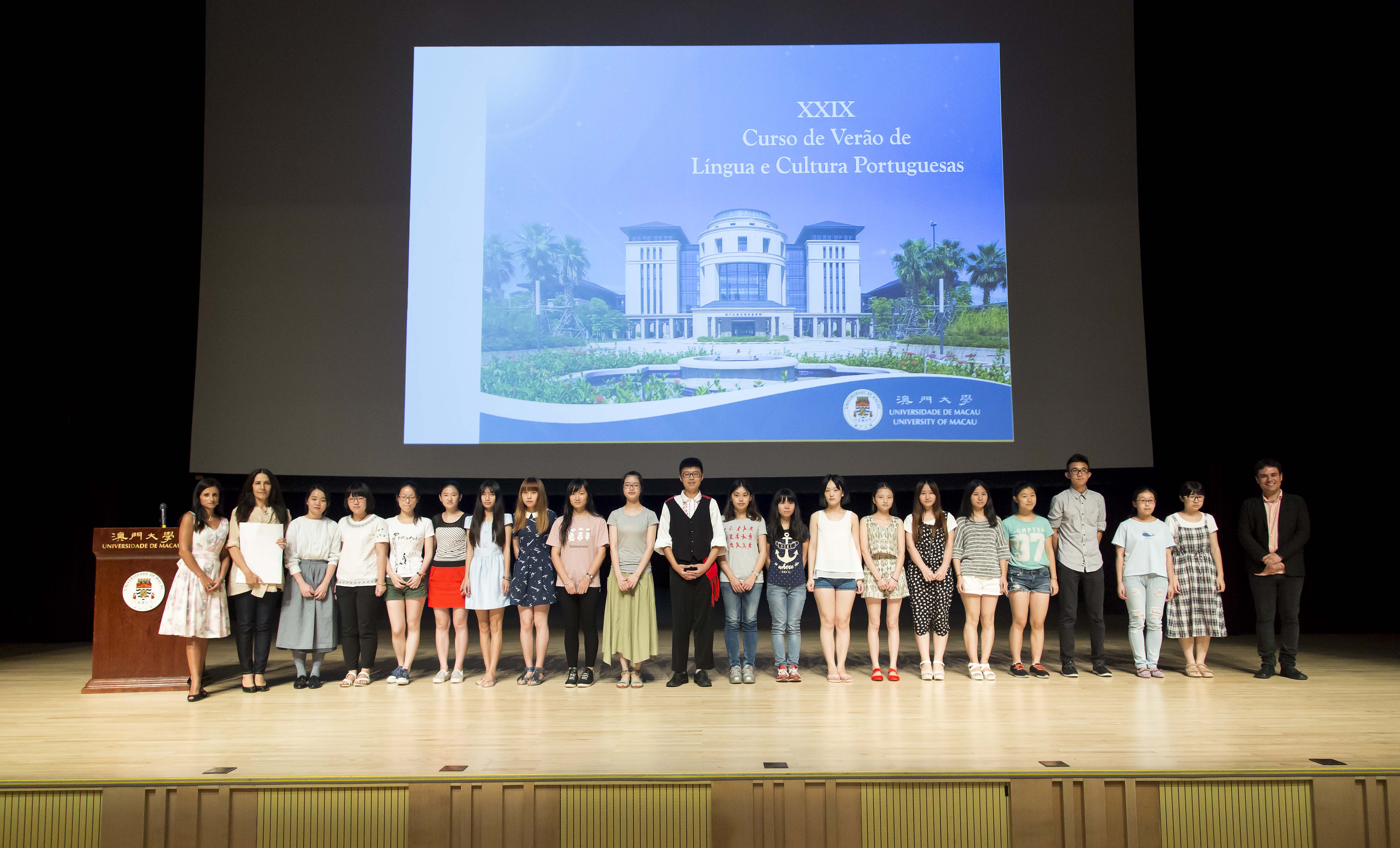The University of Macau (UM) today (31 July) held a closing ceremony for the 29th Portuguese Language and Culture Summer Course in the University Hall. This is the first time that the Portuguese Language and Culture Summer Course has been held on the new campus. This year’s summer course attracted 274 students from around the world. During the three-week intensive course, participants lived with a dozen of Portuguese teachers, communicated with one another in Portuguese and had a firsthand experience of UM’s unique Portuguese culture in a residential college. All participants said that the course greatly improved their spoken Portuguese and offered them an opportunity to immerse themselves in the culture.