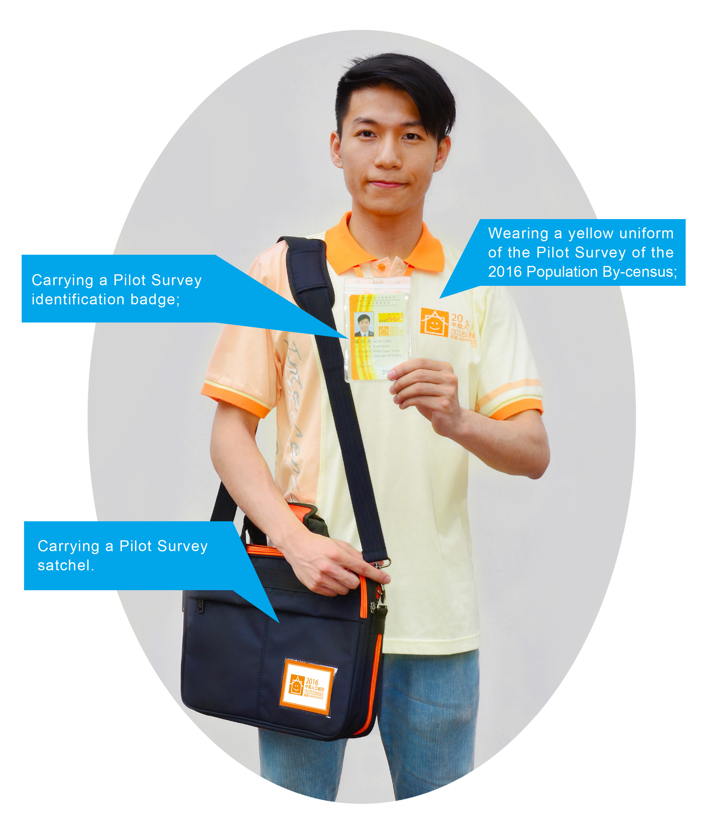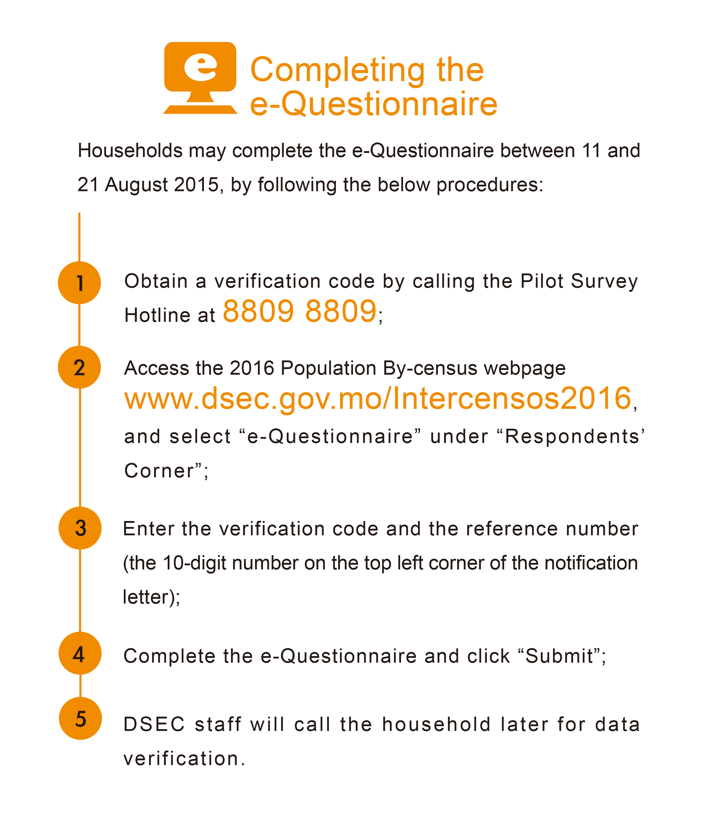 All enumerators, wearing a yellow Pilot Survey uniform and carrying a valid Enumerator Identity Card and a Pilot Survey satchel, will visit the selected housing units to collect data during the Pilot Survey period. Households may choose to complete the e-Questionnaire available at the 2016 Population By-census webpage (www.dsec.gov.mo/Intercensos2016) between 11 and 21 August. All personal and household data collected will be kept in strict confidence and used solely for statistical purposes. DSEC calls for the support of the public to provide accurate information. To verify the identity of an enumerator or make an appointment for interview, please call the Pilot Survey Hotline at 8809 8809.