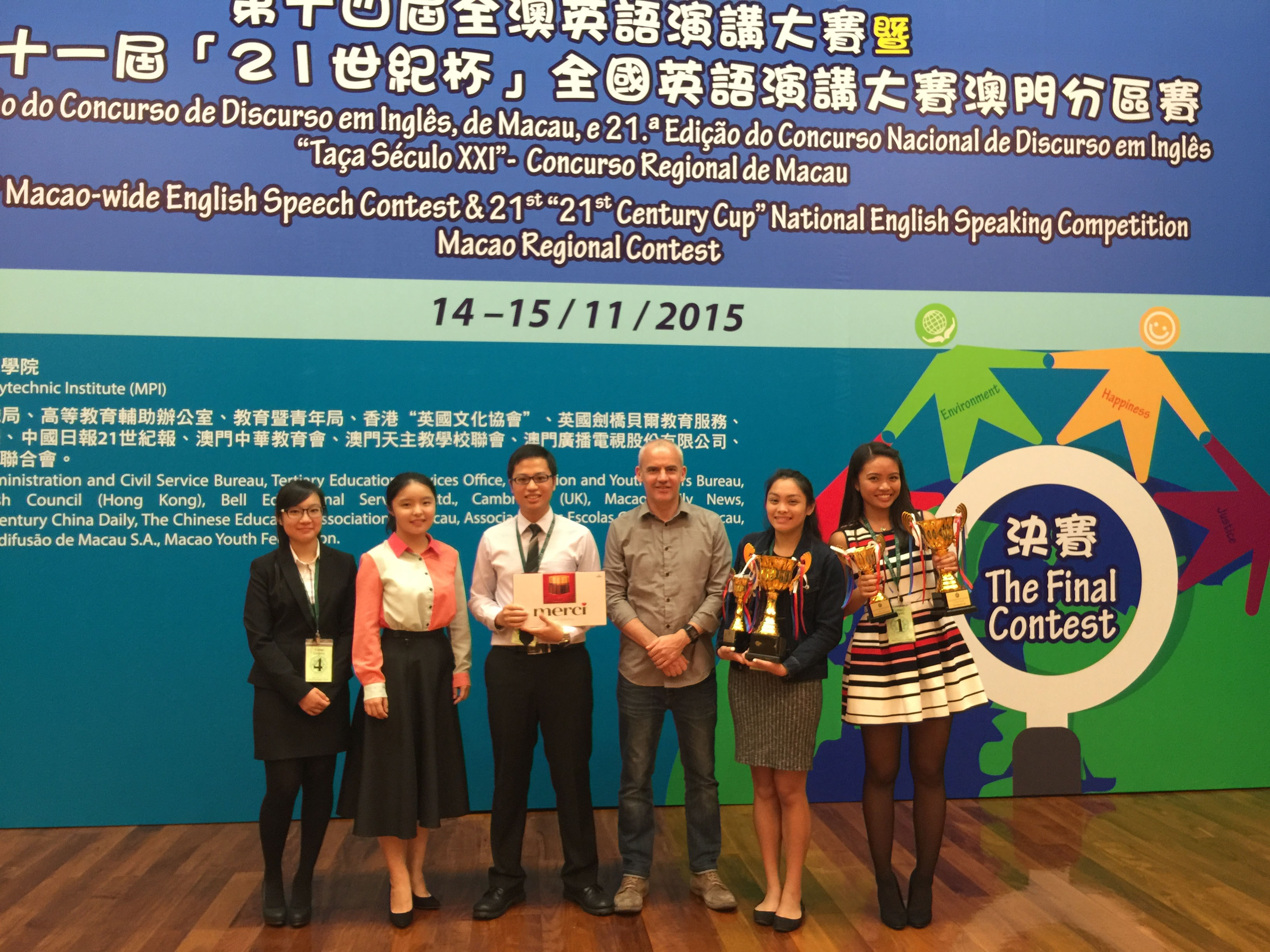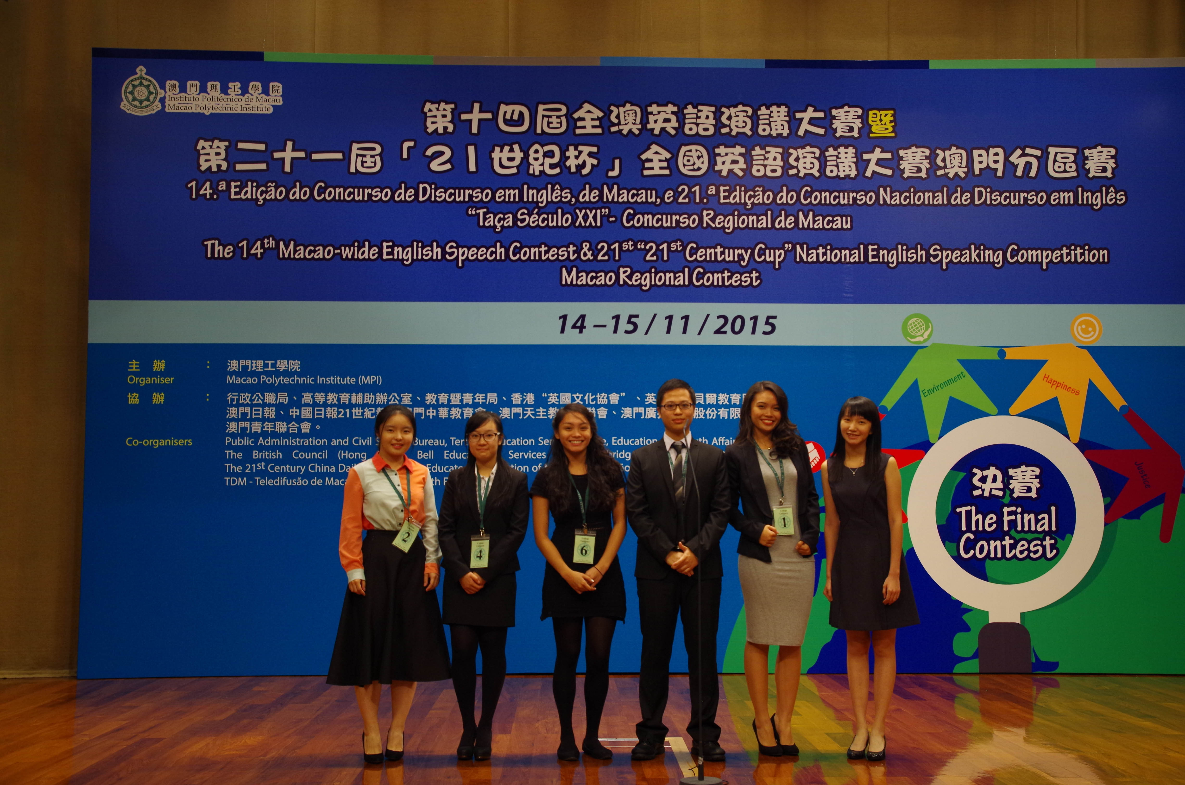 At the 14th Macao-wide English Speech Contest & 21st ‘21st Century Cup’ National English Speaking Competition (Macao Regional Contest), six students from the University of Macau (UM) Public Speaking Team won the championship in the college category and several other prizes, including a second prize in the college category, the Best Impromptu Speaker Award, and the Most Humorous Speaker Award.