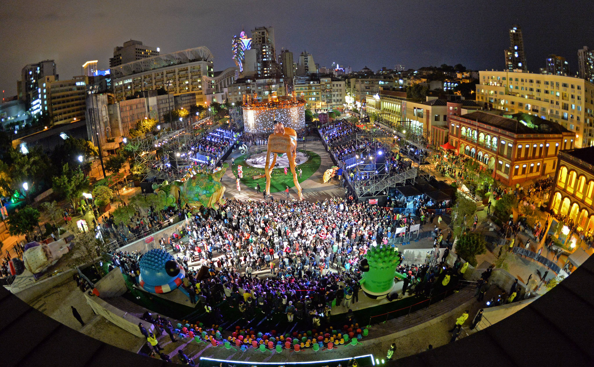 The performing groups began at the Ruins of St. Paul's and proceeded to Rua de S. Paulo, Travessa da Paixão, Largo de Santo António, Rua de D. Belchior Carneiro, Rua dos Artilheiros, Rua de Sanches de Miranda, Calçada da Igreja de S. Lázaro, Santa Casa da Misericórdia Albergue, Rua de São Roque, Rua Nova de São Lázaro, St. Lazarus Square, Rua do Volong, Rua do Tap Siac, Rua de Afonso de Albuquerque, and arrived at its final destination, Tap Seac Square, at 5:30pm to have the “Handover Celebration”. This year, the organizer set up two seating areas at Tap Seac Square so that the public could watch the performances clearly and comfortably. In the “Handover Celebration”, each performing group presented the performance one by one. French troupe Herbert’s Dream presents uncommon marvellous show on stilts whereby five enormous and four-metre high stilt artists participate in a mysterious ceremony held under hypnotising music, mutating into human light bulbs and creating a magical atmosphere. Besides, the audience were even more excited when it came with the colourful light show effect. The French group Plasticiens Volants brought giant balloon performance themed as kid’s dream. The story was originated from the classic American comic strip Little Nemo in Slumberland, with giant balloons built up the dream scene. This dream scene was brought to the sky over Tap Seac Square.