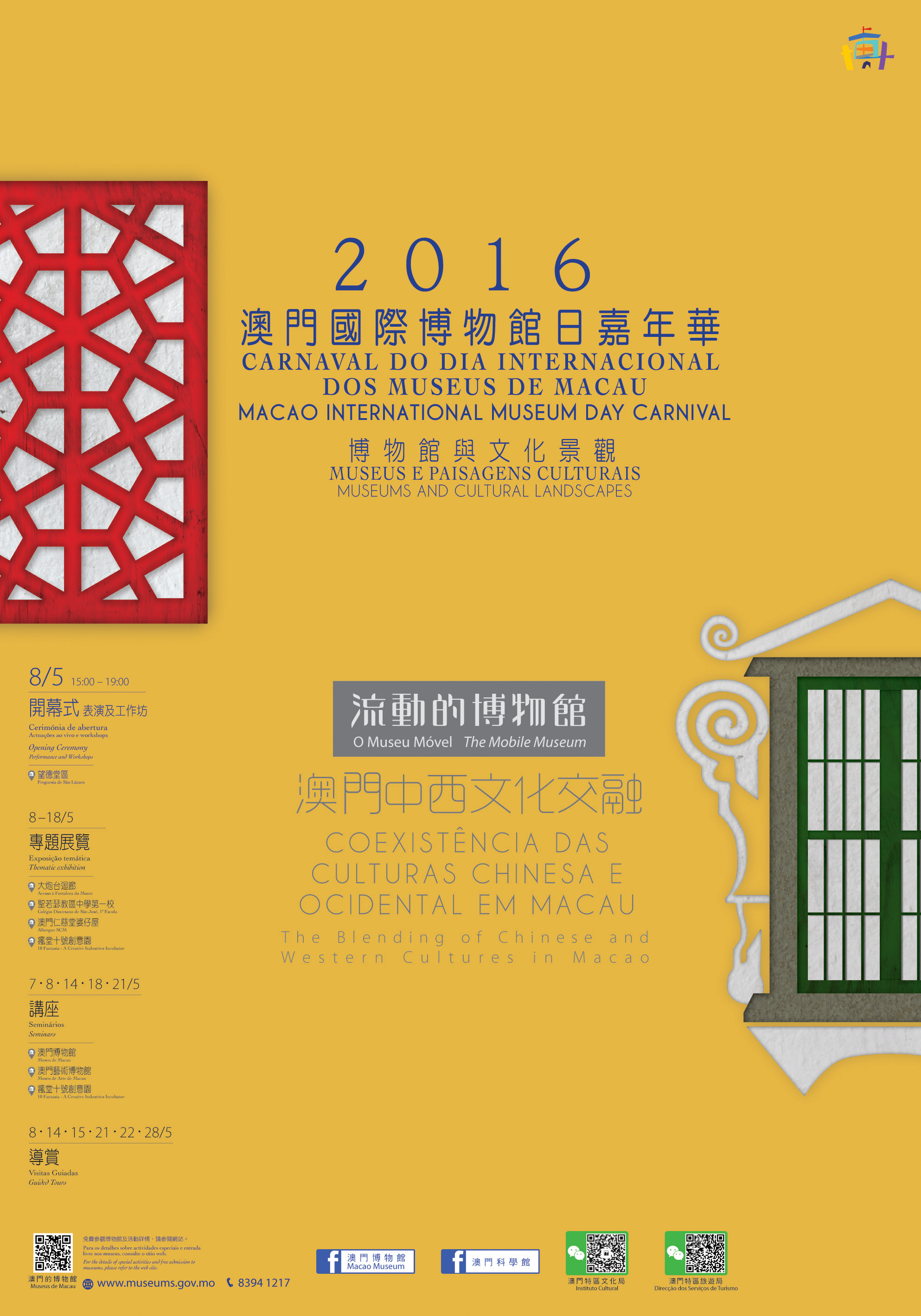The theme of the 2016 Museum International Day is the “Museums and Cultural Landscapes”. In consonance with this theme and in order to present the unique landscapes resulting from the collaboration and fusion of the Chinese and Western cultures in Macao, this edition of the “Macao International Museum Day Festival” will be held at the Bairro de S. Lázaro as a starting point, bringing the surrounding areas, historical buildings and cultural atmosphere together into an emblematic area of “Mobile Museum”, where a series of excellent activities will be organized during the month of May. These activities comprise fusion elements of the Chinese and Western cultures, such as religion, architecture, art, music, stamps, food and lifestyles, among others, including thematic exhibitions, workshops, lectures, guided tours and a street carnival, which aim to promote close by the residents and tourists the valuable cultural resources of Macao’s museums.