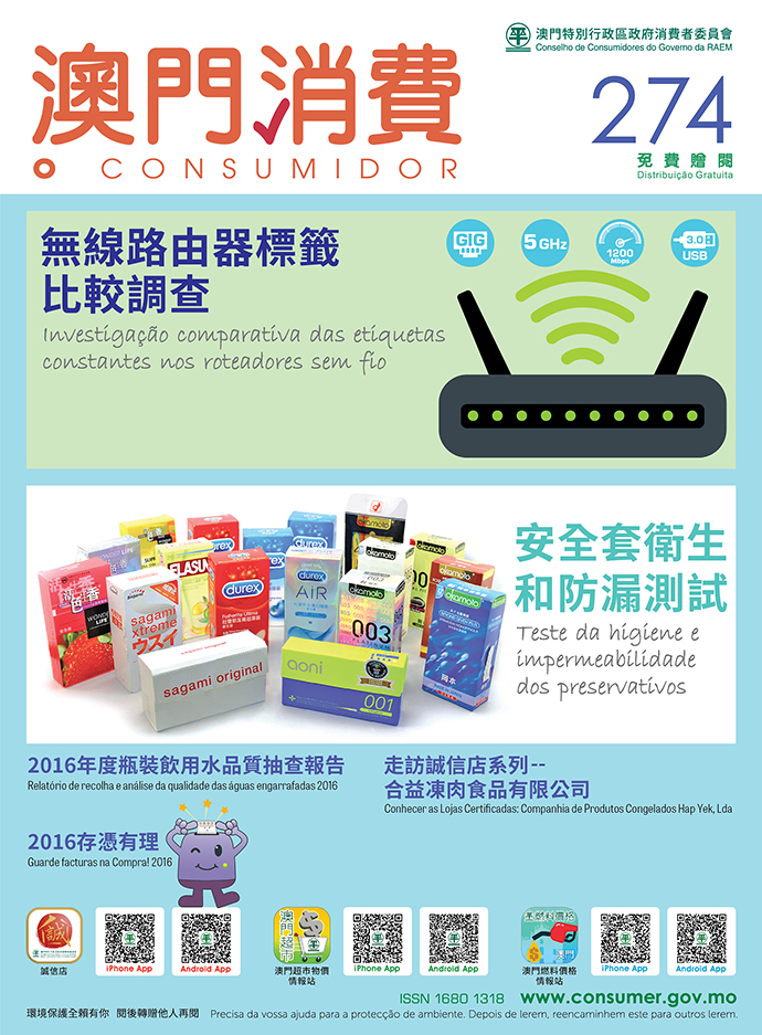 Consumer Report issue no. 274 includes a report conducted by Consumer Council on the hygienic condition and quality of condoms, and a detailed report on the analysis of product labels of routers. Consumers may get the magazine for free and various locations, or browse the contents on the Council’s website and WeChat official account.