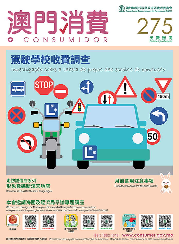 Consumer Report is now available free of charge at the Council (Av. Horta e Costa, N.º 24-A, Edf. Cheung Heng, R/C), and the service counter of the Council at Macao SAR Government Service Centre (Rua Nova da Areia Preta, Nº52), Public Information Centre at Vicky Plaza, libraries and bookstores. Consumers may also access the magazine online on the Council’s official website (http://www.consumer.gov.mo) and WeChat official account.
