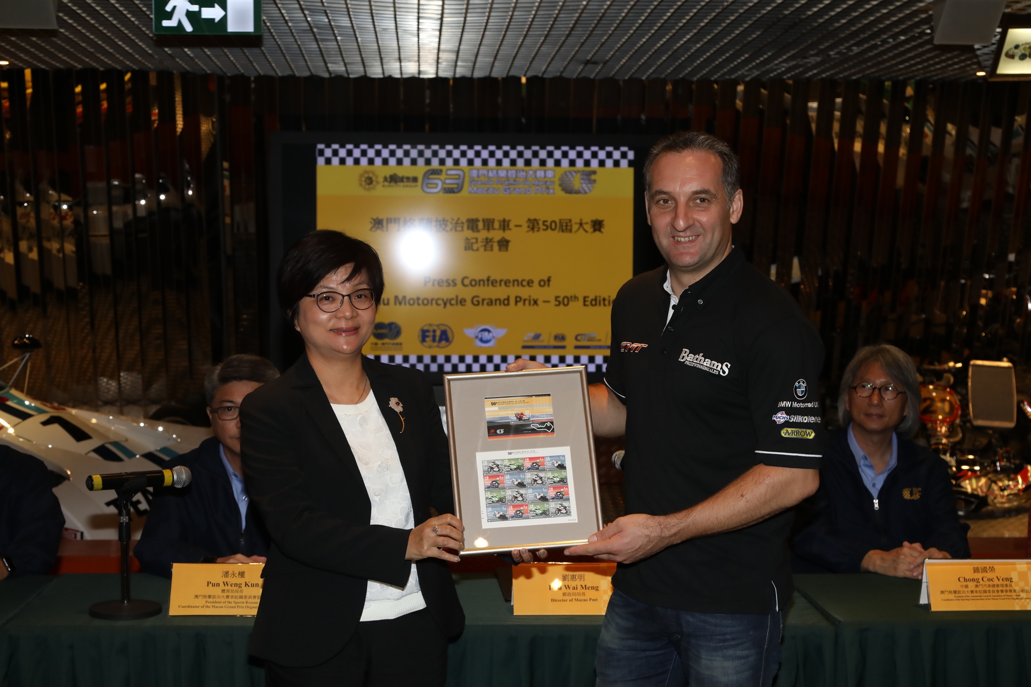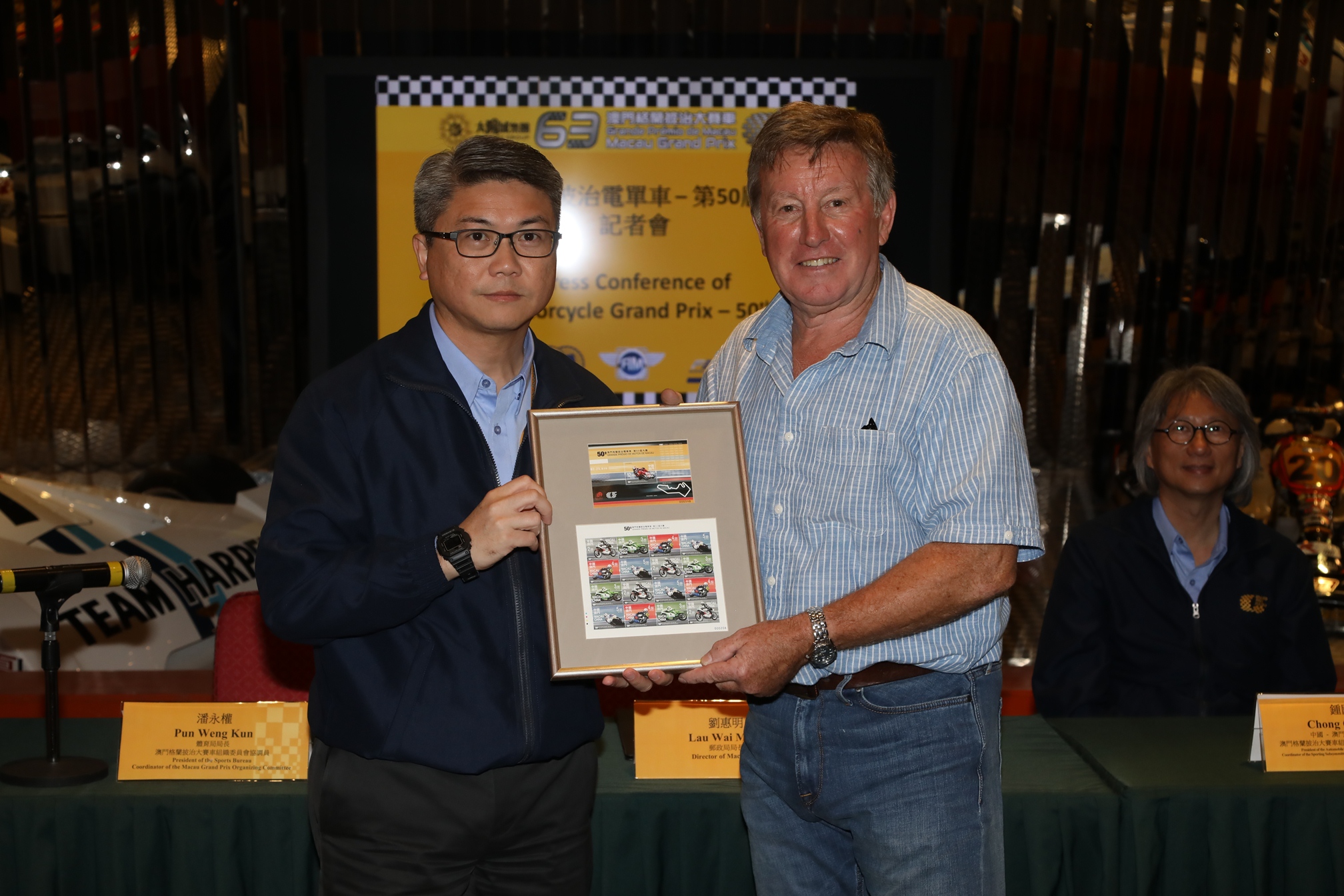 President of the Sports Bureau of the Macao SAR Government and Coordinator of the Macau Grand Prix Organizing Committee Mr. Pun Weng Kun, Director of Macao Post Ms. Lau Vai Meng, Chairman of the Automobile General Association of Macao-China Mr. Lo Keng Chio, and President of the Automobile General Association of Macao-China and Coordinator of the Sporting Subcommittee of the Macau Grand Prix Organizing Committee Mr. Chong Coc Veng, were joined at a press conference to announce the stamps, Macao Pass and Worker Playground collection by eight-time Macau Motorcycle Grand Prix winner Michael Rutter and Mick Grant, who conquered the Guia Circuit in 1977 and 1984.