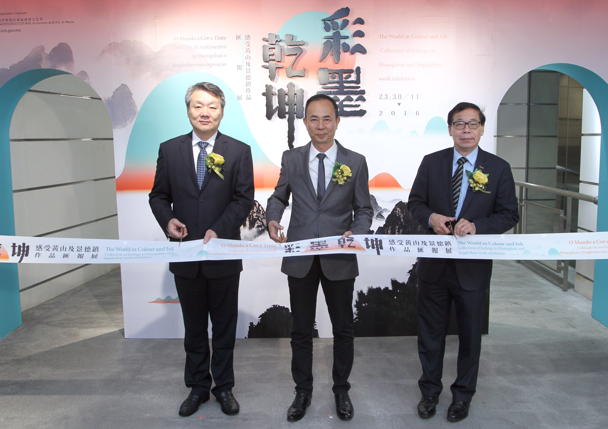 Organised by the Cultural Affairs Bureau (IC), the “The World in Colour and Ink – Collection of Feelings to Huangshan and Jingdezhen work exhibition” was inaugurated on 22 November, at 6pm, at the Mount Fortress Corridor. The opening ceremony was officiated by the President of the Cultural Affairs Bureau of the Macao S.A.R. Government, Ung Vai Meng; the Assistant of the Chief of the Department of Education and Culture of the Liaison Office of the Central People’s Government in the Macao S.A.R., Shao Bin; and the President of the Macau Artist Society, Lai Ieng. This exhibition features artworks by 11 Macao artists who travelled to Huangshan in Anhui Province and Jingdezhen in Jiangxi Province to develop live works. Admission is free and all are welcome.